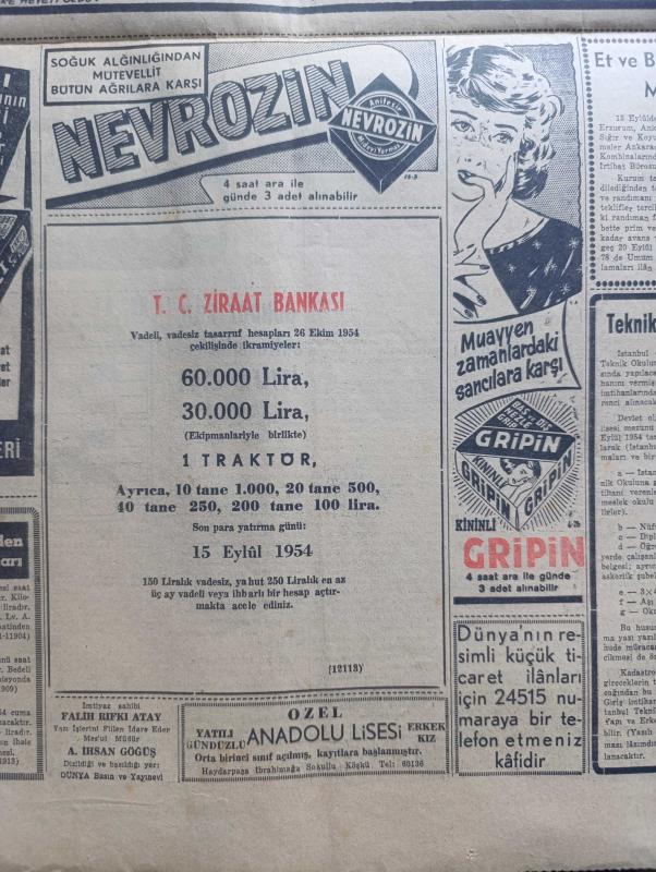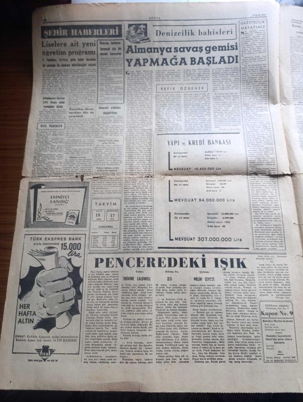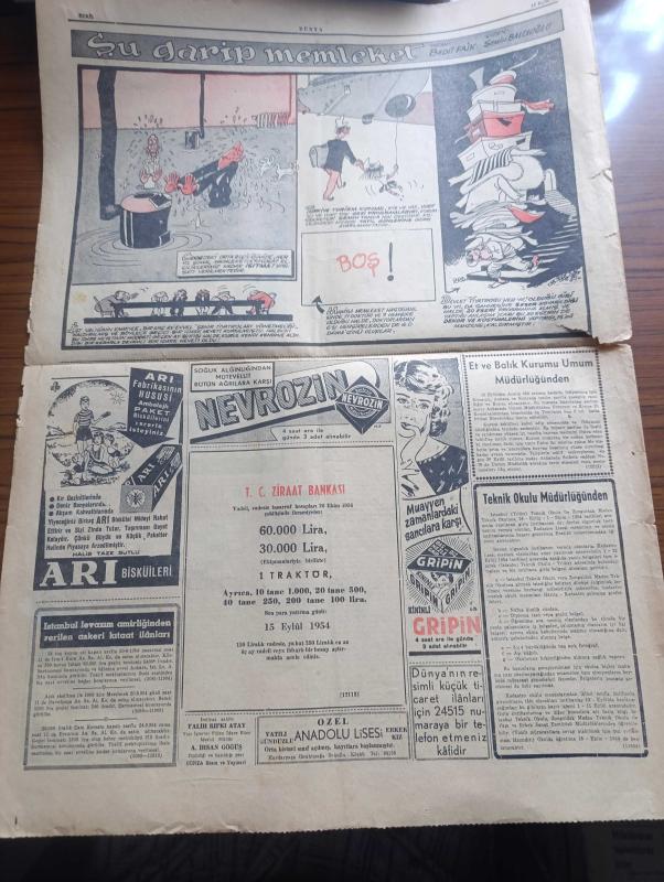 Dünya Gazetesi - 15 Eylül 1954 - herkes vazifesini yapmalı kafi yazan Falih Rıfkı Atay Başmakale - bir yolsuzluğun on dört maddelik hikayesi - Bahar Bayramı sergisine ait müfettiş raporunu neşrediyoruz - 1954 Türkiye fotoğraf kraliçesi seçiminde 24 No.lu Yıldız Akyüz'e oy veren okuyucular arasında kura çekildi fotoğraf - Bahar bayramında Celal Bayar'ın elini öpen belediye hesap müdürü Enver Aşkın fotoğraf - Almanya'nın kalburüstü sanat tenkitçilerinden Flemming ile bir konuşma - sahte imza ile para çekenler fotoğraf - sümerbank'ta damga pulu yolsuzluğu - penceredeki ışık çeviren Melih Cevdet yazı dizisi - Almanya savaş gemisi yapmaya başladı yazan Refik Özgener - Muzaffer kayalıbay davası tanıkları Dün de yargılandı - Gündüz Kılıç antrenörlükten istifa etti - Yapı ve Kredi Bankası - Türk Ekspres bank - otomobil plakaları değiştiriliyor - şu garip memleket yazan Bedii Faik çizen Semih Balcıoğlu - arı bisküvileri - nevrozin - Ziraat Bankası - Gripin - Özel Anadolu Lisesi kayıtları adlı eser, Kitap > Süreli Yayınlar > Gazeteler > Türkiye > Genel > Günlük kategorisinde İkinci El olarak satıştadır.