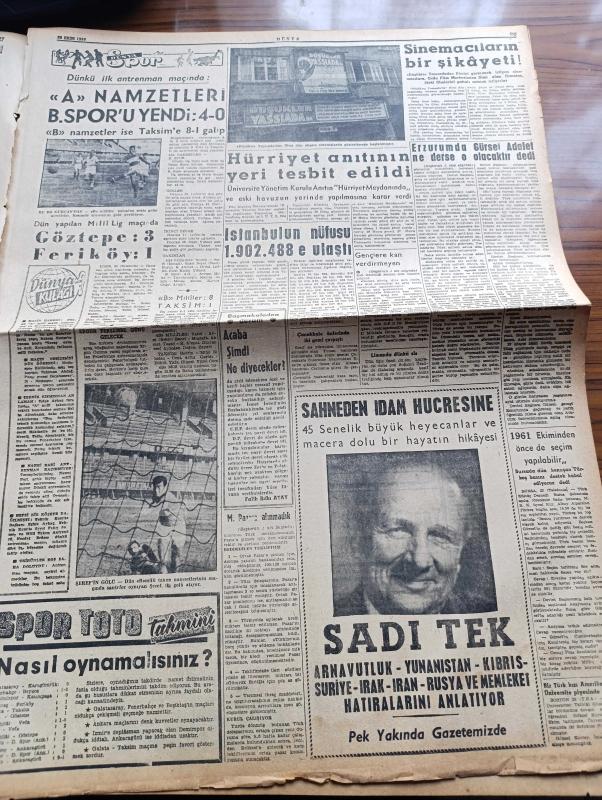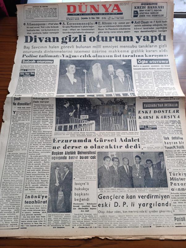 Dünya Gazetesi - 26 Ekim 1960 - Yassıada'da Divan Gizli Oturum Yaptı - Başsavcının Halen Görevli Bulunan Milli Emniyet Mensubu Tanıklarının Gizli Oturumda Dinlenmeleri İstedi - Athenagoras İfade Veriyor - 6 7 Eylül Davası - Adnan Menderes - Celal Bayar - İsmet İnönü'ye Tezahürat - Erzurum'da Cemal Gürsel Adalet Ne Derse O Olacaktır Dedi - Gençlere Kan Verdirmeyen Eski Demokrat Partili Doktor Bedri Bozoğlu Yargılandı - Türkiye Müşterek Pazar'a Alınmadı - Toprak Mahsulleri Ofisi Francalık Un Vermesi İstendi - Parisli Metres Yazan Jean Freustie Yazı Dizisi - A Milli Takım Namzetleri Beyoğluspor'u Yendi - İstanbul'un Nüfusu 1.902.488 e Ulaştı - Hürriyet Anıtının Yeri Tesbit Edildi - Grip İçin Yeni İlaç Bulundu - Sandra Çizgi Roman - Roy Rogers Çizgi Roman - Lindi Çizgi Roman - Yargıç Parker Çizgi Roman - Af Bayramdan Önce Çıkacak - İzmir Sabah Postası Gazetesi Başyazarı Orhan Rahmi Gökçe İfade Veriyor adlı eser, Kitap > Süreli Yayınlar > Gazeteler > Türkiye > Genel > Günlük kategorisinde İkinci El olarak satıştadır.
