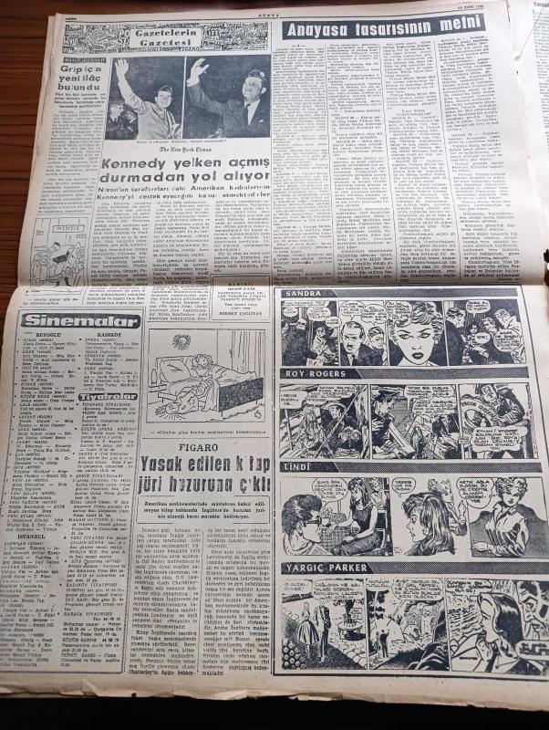 Dünya Gazetesi - 26 Ekim 1960 - Yassıada'da Divan Gizli Oturum Yaptı - Başsavcının Halen Görevli Bulunan Milli Emniyet Mensubu Tanıklarının Gizli Oturumda Dinlenmeleri İstedi - Athenagoras İfade Veriyor - 6 7 Eylül Davası - Adnan Menderes - Celal Bayar - İsmet İnönü'ye Tezahürat - Erzurum'da Cemal Gürsel Adalet Ne Derse O Olacaktır Dedi - Gençlere Kan Verdirmeyen Eski Demokrat Partili Doktor Bedri Bozoğlu Yargılandı - Türkiye Müşterek Pazar'a Alınmadı - Toprak Mahsulleri Ofisi Francalık Un Vermesi İstendi - Parisli Metres Yazan Jean Freustie Yazı Dizisi - A Milli Takım Namzetleri Beyoğluspor'u Yendi - İstanbul'un Nüfusu 1.902.488 e Ulaştı - Hürriyet Anıtının Yeri Tesbit Edildi - Grip İçin Yeni İlaç Bulundu - Sandra Çizgi Roman - Roy Rogers Çizgi Roman - Lindi Çizgi Roman - Yargıç Parker Çizgi Roman - Af Bayramdan Önce Çıkacak - İzmir Sabah Postası Gazetesi Başyazarı Orhan Rahmi Gökçe İfade Veriyor, Falih Rıfkı Atay tarafından kaleme alınmıştır. Dünya Gazetesi - 26 Ekim 1960 - Yassıada'da Divan Gizli Oturum Yaptı - Başsavcının Halen Görevli Bulunan Milli Emniyet Mensubu Tanıklarının Gizli Oturumda Dinlenmeleri İstedi - Athenagoras İfade Veriyor - 6 7 Eylül Davası - Adnan Menderes - Celal Bayar - İsmet İnönü'ye Tezahürat - Erzurum'da Cemal Gürsel Adalet Ne Derse O Olacaktır Dedi - Gençlere Kan Verdirmeyen Eski Demokrat Partili Doktor Bedri Bozoğlu Yargılandı - Türkiye Müşterek Pazar'a Alınmadı - Toprak Mahsulleri Ofisi Francalık Un Vermesi İstendi - Parisli Metres Yazan Jean Freustie Yazı Dizisi - A Milli Takım Namzetleri Beyoğluspor'u Yendi - İstanbul'un Nüfusu 1.902.488 e Ulaştı - Hürriyet Anıtının Yeri Tesbit Edildi - Grip İçin Yeni İlaç Bulundu - Sandra Çizgi Roman - Roy Rogers Çizgi Roman - Lindi Çizgi Roman - Yargıç Parker Çizgi Roman - Af Bayramdan Önce Çıkacak - İzmir Sabah Postası Gazetesi Başyazarı Orhan Rahmi Gökçe İfade Veriyor adlı eser Türkçe dilindedir.