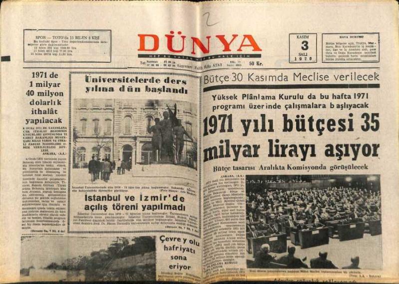 Dünya Gazetesi 3 Kasım 1970 - 1971 Yılı Bütçesi 35 Milyar Lirayı Aşıyor GZ68272, en son 20 gün önce güncellenmiştir.