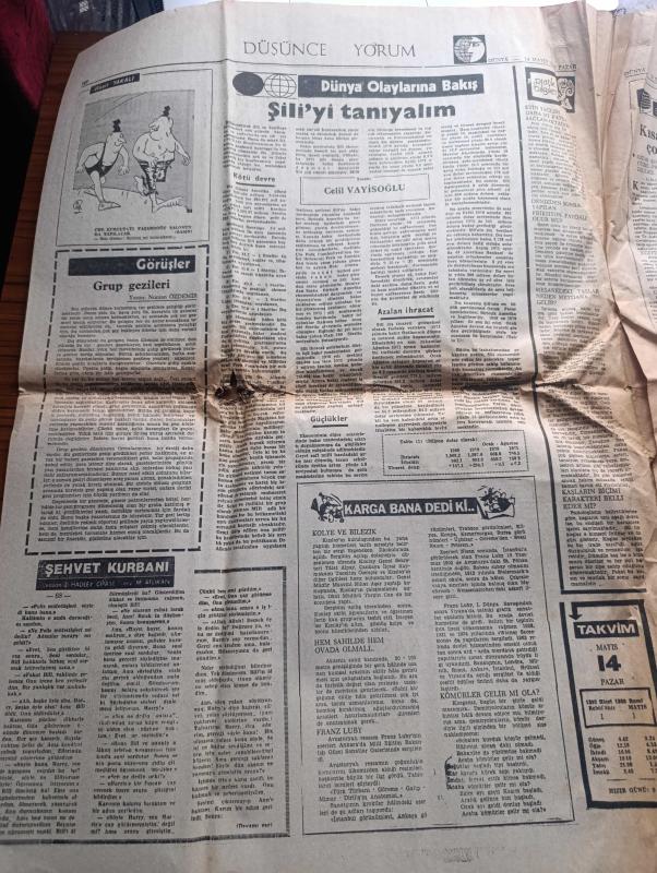 Dünya Gazetesi - Turkish Newspaper - 14 Mayıs 1972 - Suat Hayri Ürgüplü hükümeti açıkladı - kabine 9 Adalet Partili 5 CHP'li 2 MGP'li 3 DP'li 5 bağımsız üyeden Kurulu - İskender Cenap Ege Gençlik ve Spor Bakanı oldu - sınıfta kalma usulünün kaldırılması düşünülüyor - başbakan adayı Suat Hayri Ürgüplü Süleyman Demirel ile yaptığı görüşmeden sonra görülüyor fotoğraf - sabıkalılar toplatıldı - Ordu ne istiyor yazan M. Emin Aytekin - 47 il başkanının genel başkan adayı Bülent Ecevit - uzay otobüsleri için NASA'ya teklif yapıldı - kadınlarda FBI ajansı olabilecek - İstanbul Ankara radyo programı - sinema üzerine bir araştırma komedinin altın çağı yazan James Agee - Saygon'daki polonyalılar kapı dışarı ediliyor - Fenerbahçe'de futbol oynamam diyen Ostojic ani olarak belgrad'a gitti - Amigo Orhan Beşiktaş için canımı veririm fotoğraf - Eşref Aydın Fenerbahçe'de Genel sekreterlik görevinden istifa etti fotoğraf - Galatasaray Şeref turuna hazırlanıyor -Giresunspor Vefa önünde galibiyeti kaçırdı, Falih Rıfkı Atay tarafından kaleme alınmıştır. Dünya Gazetesi - Turkish Newspaper - 14 Mayıs 1972 - Suat Hayri Ürgüplü hükümeti açıkladı - kabine 9 Adalet Partili 5 CHP'li 2 MGP'li 3 DP'li 5 bağımsız üyeden Kurulu - İskender Cenap Ege Gençlik ve Spor Bakanı oldu - sınıfta kalma usulünün kaldırılması düşünülüyor - başbakan adayı Suat Hayri Ürgüplü Süleyman Demirel ile yaptığı görüşmeden sonra görülüyor fotoğraf - sabıkalılar toplatıldı - Ordu ne istiyor yazan M. Emin Aytekin - 47 il başkanının genel başkan adayı Bülent Ecevit - uzay otobüsleri için NASA'ya teklif yapıldı - kadınlarda FBI ajansı olabilecek - İstanbul Ankara radyo programı - sinema üzerine bir araştırma komedinin altın çağı yazan James Agee - Saygon'daki polonyalılar kapı dışarı ediliyor - Fenerbahçe'de futbol oynamam diyen Ostojic ani olarak belgrad'a gitti - Amigo Orhan Beşiktaş için canımı veririm fotoğraf - Eşref Aydın Fenerbahçe'de Genel sekreterlik görevinden istifa etti fotoğraf - Galatasaray Şeref turuna hazırlanıyor -Giresunspor Vefa önünde galibiyeti kaçırdı adlı eser Türkçe dilindedir.