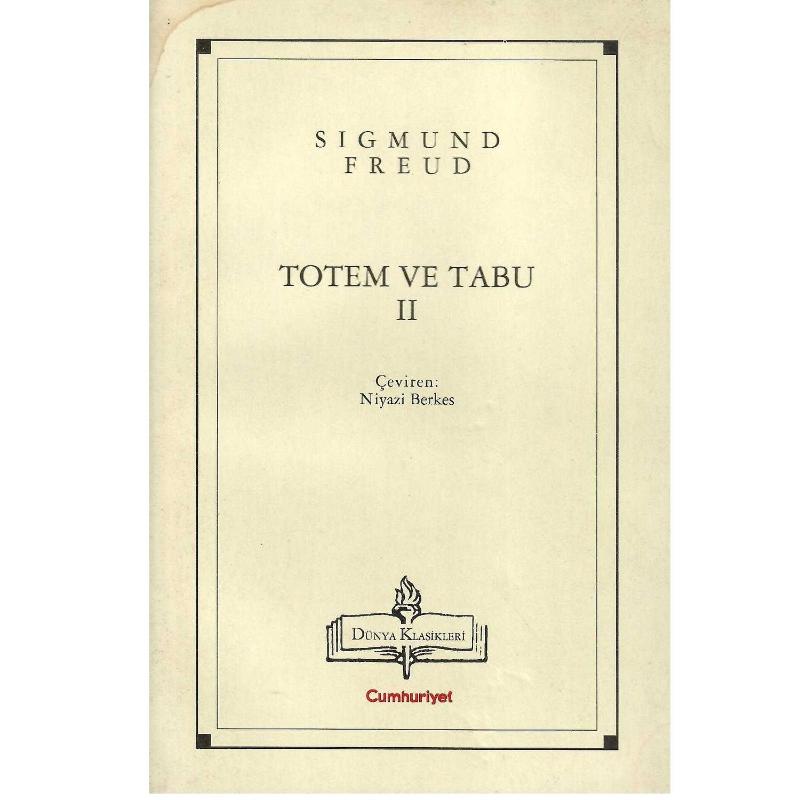 Dünya Klasikleri - Totem ve Tabu (2.Kitap) Sigmund Freud, Sigmund Freud tarafından kaleme alınmıştır. Eser Egemen Berköz editörlüğünde hazırlanmıştır. Kitap 1998 yılında Cumhuriyet Kitapları tarafından [İstanbul] 7822547784007 ISBN kodu ile yayınlanmıştır. Bu baskının çevirisi Niyazi Berkes tarafından yapılmıştır. 128 sayfadır. Dünya Klasikleri - Totem ve Tabu (2.Kitap) Sigmund Freud adlı eser Türkçe dilindedir.
