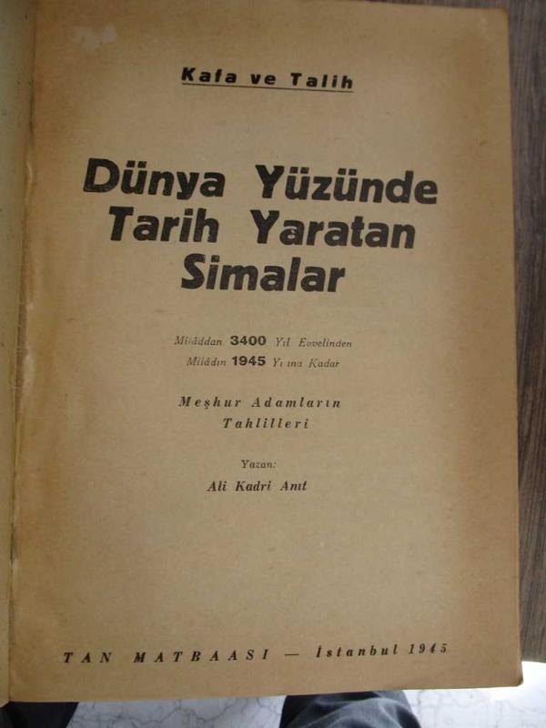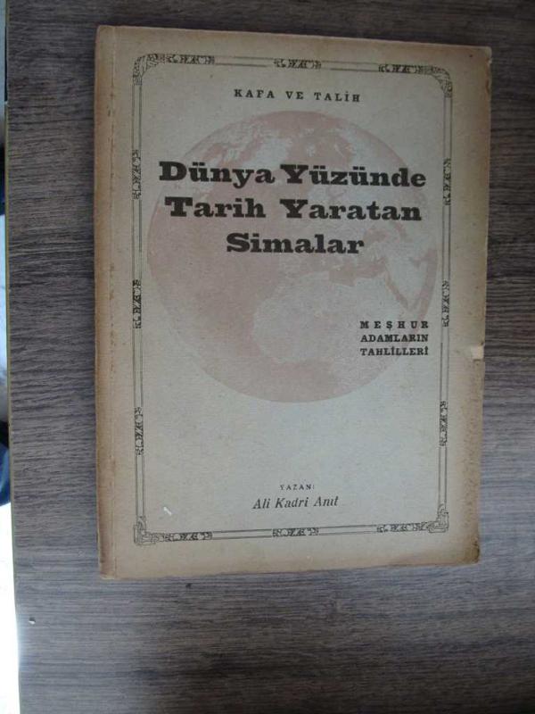 Dünya Yüzünde Tarih Yaratan Simalar "Kafa ve Talih" (Meşhur Adamların Tahlilleri), Ali Kadri Anıt tarafından kaleme alınmıştır. Kitap 1945 yılında Tan Matbaası tarafından yayınlanmıştır. Dünya Yüzünde Tarih Yaratan Simalar "Kafa ve Talih" (Meşhur Adamların Tahlilleri) adlı eser Türkçe dilindedir.