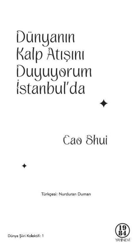 Dünyanın Kalp Atışını Duyuyorum İstanbul'da, Cao Shui tarafından kaleme alınmıştır. Kitap 2023 yılında 1984 Yayınevi tarafından [İstanbul] 9786057229328 ISBN kodu ile yayınlanmıştır. Satışta olan kitap, yayınevinin 1. baskısıdır. Bu baskının çevirisi Nurduran Duman tarafından yapılmıştır. 48 sayfadır. Dünyanın Kalp Atışını Duyuyorum İstanbul'da adlı eser Türkçe dilindedir.