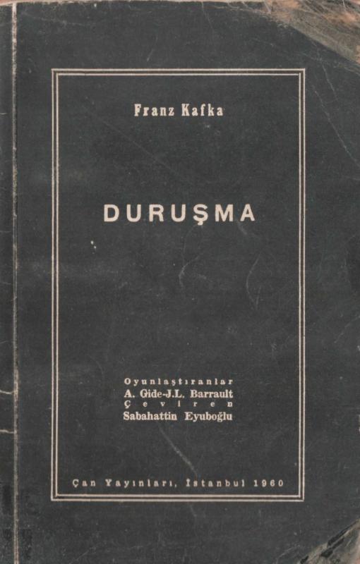 Duruşma - Sebahattin Eyüboğlu Çevirisi - Oyunlaştıran / A. Gide, J. L. Barrault, Franz Kafka tarafından kaleme alınmıştır. Eser A. Gide, J.L. Barrault editörlüğünde hazırlanmıştır. Kitap 1960 yılında Çan Yayınları tarafından [İstanbul] yayınlanmıştır. Bu baskının çevirisi Sabahattin Eyuboğlu tarafından yapılmıştır. 94 sayfadır. Duruşma - Sebahattin Eyüboğlu Çevirisi - Oyunlaştıran / A. Gide, J. L. Barrault adlı eser Türkçe dilindedir.