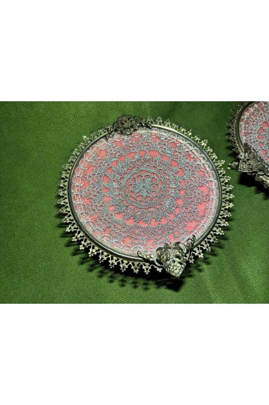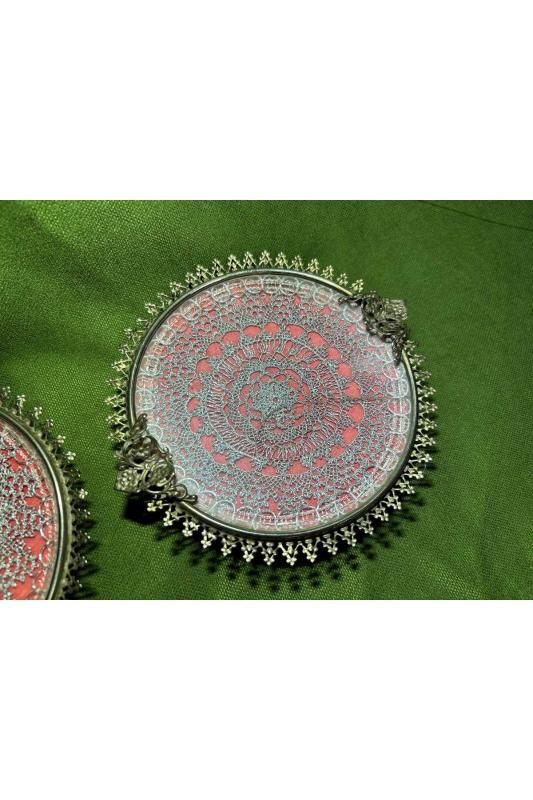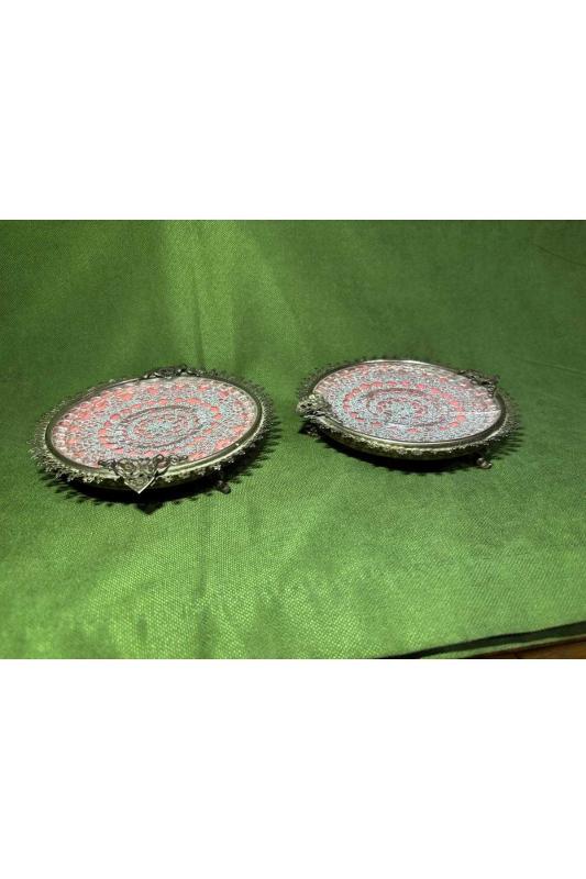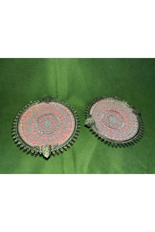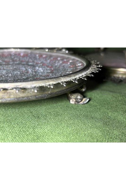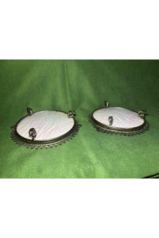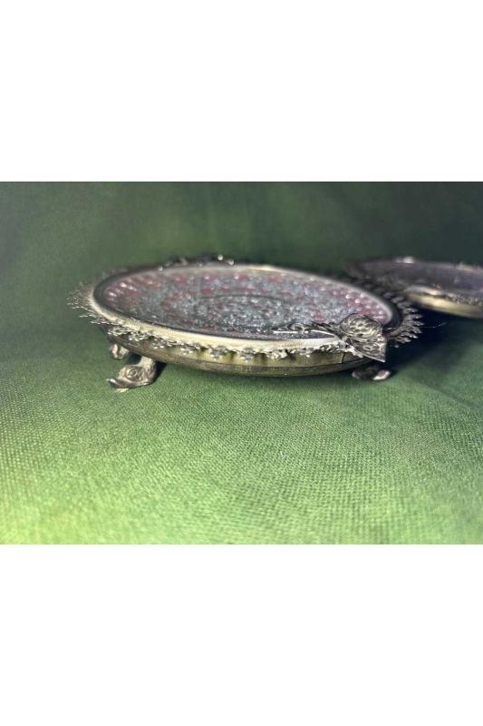 Düşük ayar gümüş ten camlı bir çift küllük 14 cm çaplarında başlıklı antika/koleksiyon objesinin menşei belirtilmemiştir. Objenin ait olduğu dönem bilinmeketedir.