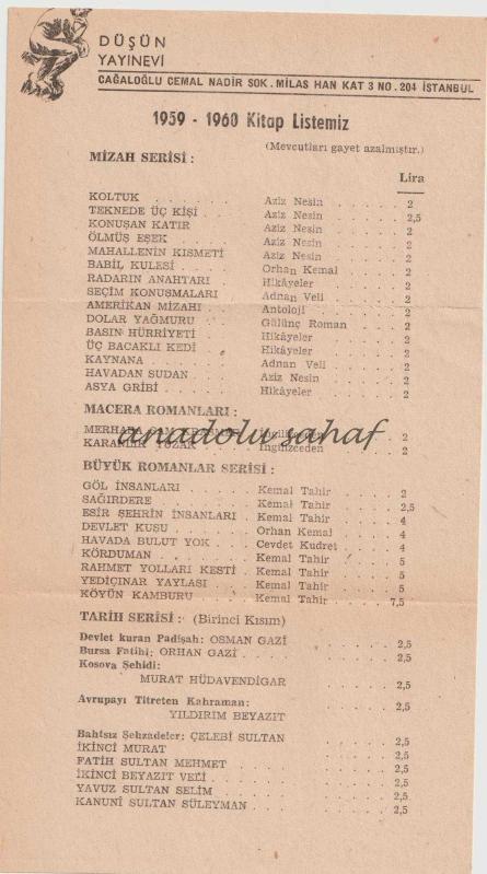 Düşün Yayınevi 1959 - 1960 Kitap Listesi, en son 1 yıl önce güncellenmiştir.