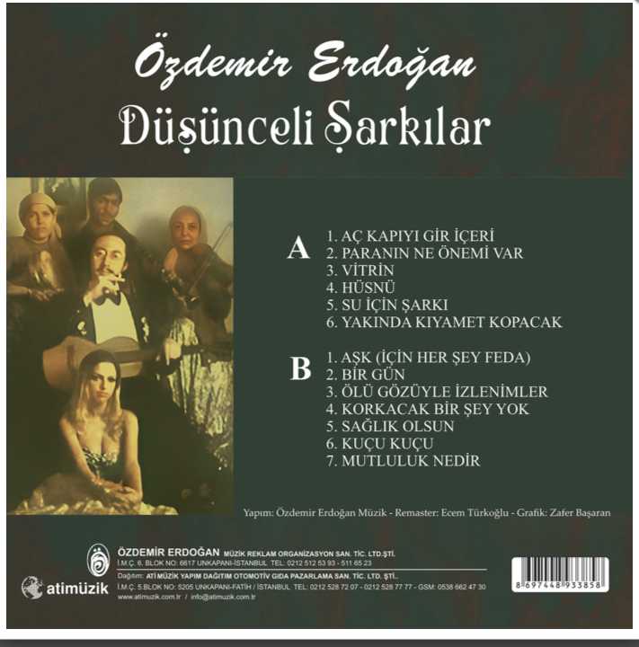 Düşünceli Şarkılar Plak Özdemir Erdoğan SIFIR JELATİNLİ Yurtiçi veya Aras Kargo ile gönderilecektir. Anonim) 1. Aç Kapıyı Gir İçeri 2. Paranın Ne Önemi Var 3. Vitrin 4. Hüsnü 5. Su İçin Şarkı 6. Yakında Kıyamet Kopacak 7. Aşk (İçin Her Şey Feda) 8. Bir Gün 9. Ölü Gözüyle İzlenimler 10. Korkacak Bir Şey Yok 11. Sağlık Olsun 12. Kuçu Kuçu 13. Mutluluk Nedir