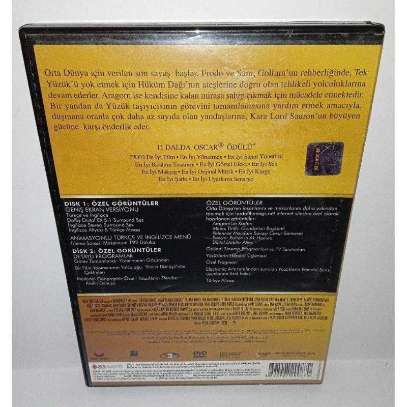 Dvd Yüzüklerin efendisi kralın dönüşü. Orijinal. Türkçe ve İngilizce dublaj. 2 disk. Film diskinde çalışmasını etkilemeyen yoğun çizikler var. Bonus disk ise 10 üzerinden 8.5 ikisi de sorunsuz çalışıyor