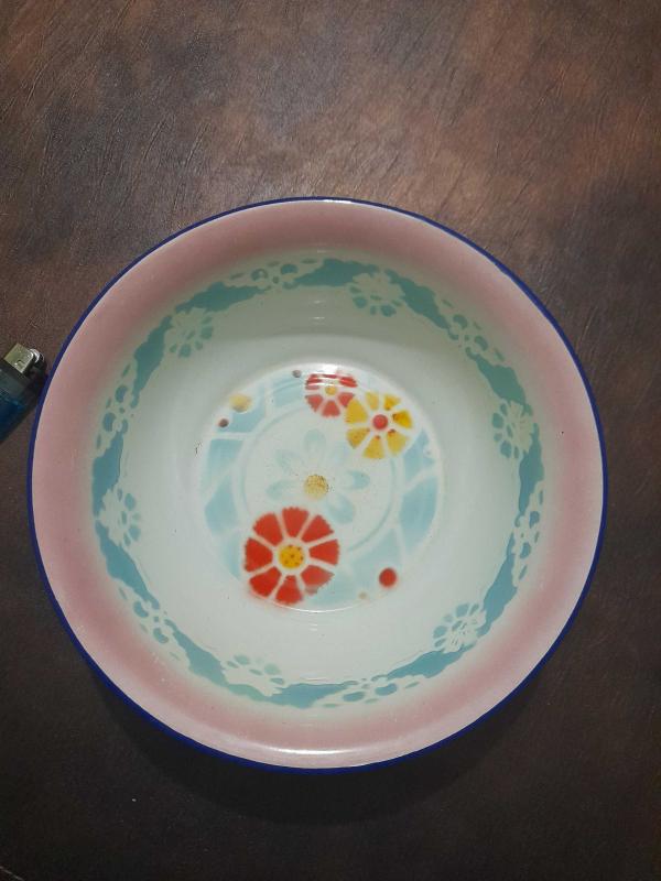 Çiçek desenli Dönem çinko emaye büyük boy tabak ÇİN MALI DAMGALI derinlik 6 cm çapı 22 cm. Atıklar var