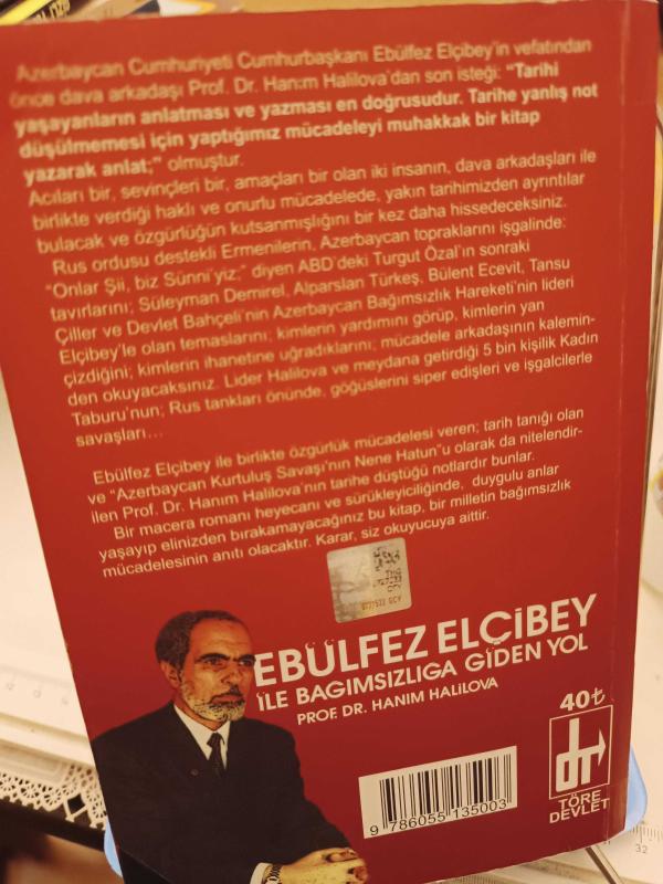 EBÜLFEZ ELÇİBEY İLE BAĞIMSIZLIĞA GİDEN YOL (EBÜLFEZ ELÇİBEY'İN VASİYETİ ÜZERİNE YAZILMIŞTIR., PROF. DR. HANIM HALİLOVA tarafından kaleme alınmıştır. Eser GÖNÜL İSMAİLBEYLİ, ZÜMRÜT KARATEKİN editörlüğünde hazırlanmıştır. Kitap 2017 yılında TÖRE-DEVLET YAYINEVİ YAYINLARI tarafından [İSTANBUL] 978-605-513-500-3 ISBN kodu ile yayınlanmıştır. Satışta olan kitap, yayınevinin 3. baskısıdır. 520 sayfadır. Sayfa bilgisi 2. HAMUR olarak belirtilmiştir. EBÜLFEZ ELÇİBEY İLE BAĞIMSIZLIĞA GİDEN YOL (EBÜLFEZ ELÇİBEY'İN VASİYETİ ÜZERİNE YAZILMIŞTIR. adlı eser Türkçe dilindedir.