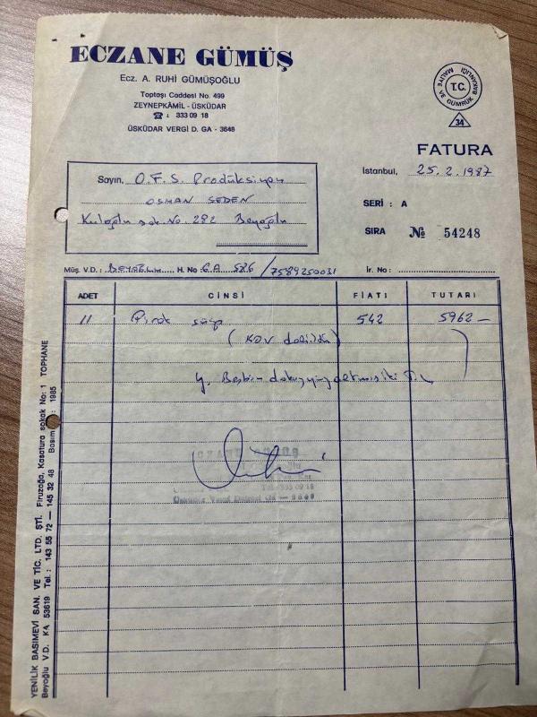 ECZANE FATURASI - 25 ŞUBAT 1987 - ECZANE GÜMÜŞ - ECZ.A.RUHİ GÜMÜŞOĞLU - ÜSKÜDAR, İSTANBUL - OSMAN FAHİR SEDEN, O.F.S. PRODÜKSİYON - BEYOĞLU, İSTANBUL - ISLAK İMZALI, KAŞELİ - 21 x 29 cm EBATLI ORİJİNAL FATURA - TÜRK SİNEMA - FİLM TARİHİ, en son 1 yıl önce güncellenmiştir.
