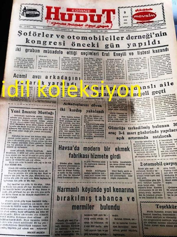 EDİRNE HUDUT GAZETESİ YEREL TAŞRA BASINI ---9 Şubat 1982 Yıl :13 Sayı :3432--Şoförler ve Otomobilciler Derneği'nin kongresi önce ki gün yapıldı--Muhariplerin danslı aile toplantısı çok neşesi geçti --Havsa da modern bir ekmek fabrikası hizmete girdi --Türk Traktör Geçen Yıl 11 Bin Traktör Üretti --Libya petrol borcumuzu alacaklarımıza sayacak ---SSK hastanelerinde ilgi görmeyen işçi özel hastanelerde ödeyeceği tedavi giderini kurumdan alabilecek --- YHK süresi 1981 'de biten 1500 toplu iş sözleşmesini ağustosa kadar yenileyecek --Uçan Daireler : Necati Seçkin --Edirne Spor özel maçta Babaeski Sporu 4-0 yenerken ikinci yarı için ümit verdi -- Sarı kırmızılı takım kaliteli bir futbol sergiledi --Edirne Spor Yönetim Kurulu Antrenör Konusunu Ele Alıyor -- adlı eser, Kitap > Süreli Yayınlar > Gazeteler > Türkiye > Mahalli kategorisinde İkinci El olarak satıştadır.