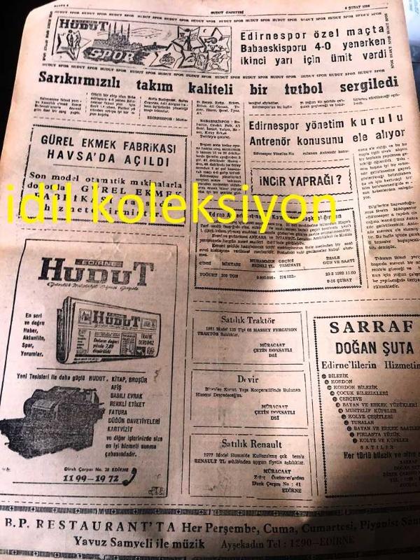 EDİRNE HUDUT GAZETESİ YEREL TAŞRA BASINI ---9 Şubat 1982 Yıl :13 Sayı :3432--Şoförler ve Otomobilciler Derneği'nin kongresi önce ki gün yapıldı--Muhariplerin danslı aile toplantısı çok neşesi geçti --Havsa da modern bir ekmek fabrikası hizmete girdi --Türk Traktör Geçen Yıl 11 Bin Traktör Üretti --Libya petrol borcumuzu alacaklarımıza sayacak ---SSK hastanelerinde ilgi görmeyen işçi özel hastanelerde ödeyeceği tedavi giderini kurumdan alabilecek --- YHK süresi 1981 'de biten 1500 toplu iş sözleşmesini ağustosa kadar yenileyecek --Uçan Daireler : Necati Seçkin --Edirne Spor özel maçta Babaeski Sporu 4-0 yenerken ikinci yarı için ümit verdi -- Sarı kırmızılı takım kaliteli bir futbol sergiledi --Edirne Spor Yönetim Kurulu Antrenör Konusunu Ele Alıyor -- Yıpranma, sararmalar, kupon kesiği ve yırtılmalar zamana bağlı olarak görülebilir.
