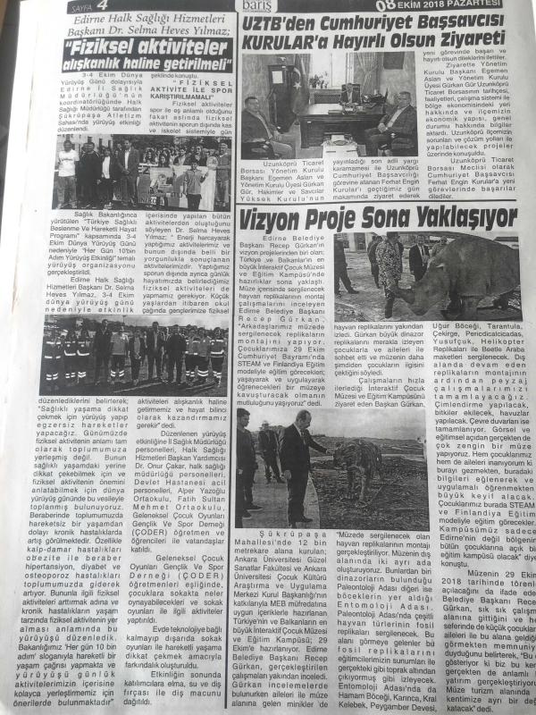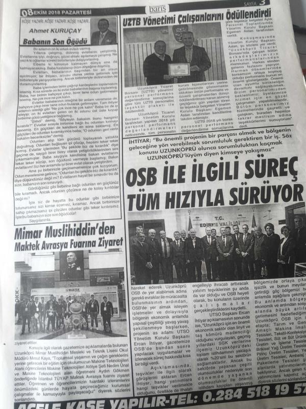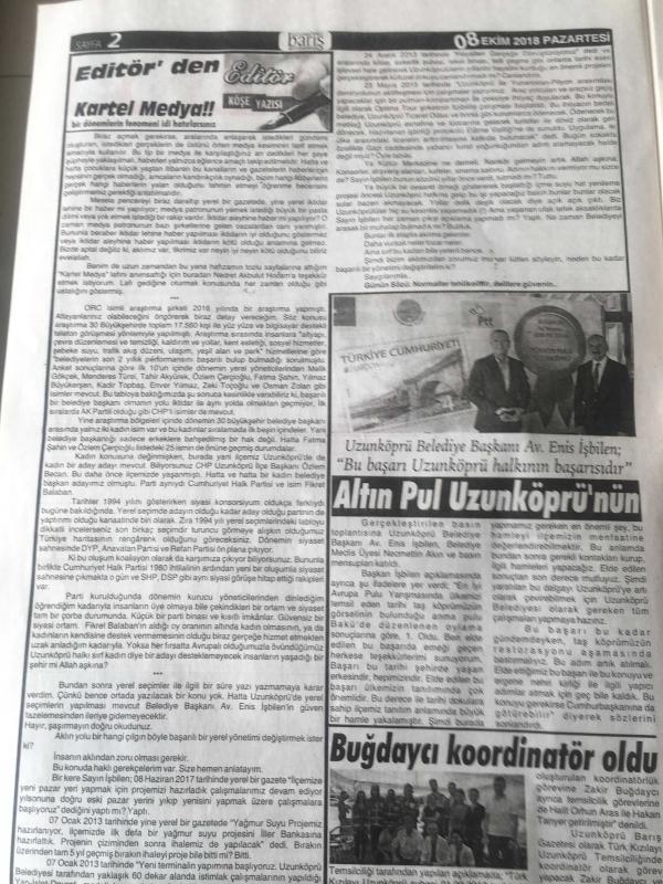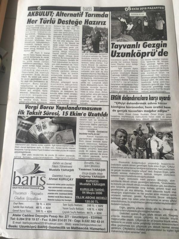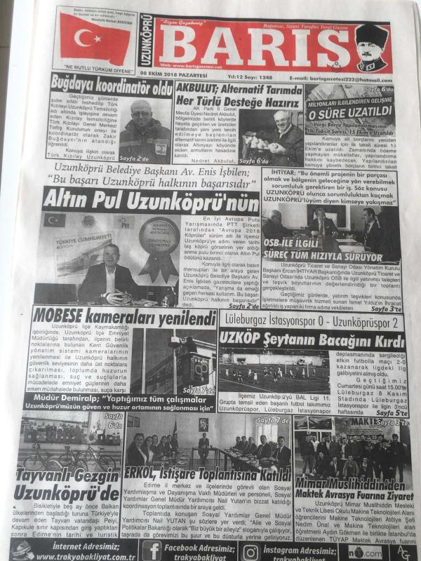 EDİRNE UZUNKÖPRÜ BARIŞ GAZETESİ YEREL TAŞRA BASINI -8 EKİM 2018 YIL :12 SAYI :1248- Buğdaycı koordinatör oldu - Akbulut : Alternatif Tarımda Her Türlü Desteğe Hazırız -Uzunköprü Belediyesi Başkanı Av. Enis İşbilen Altın Pul Uzunköprü nün - Ahmet KURUÇAY Babanın Son Öğüdü - Mimar Muslihiddin 'den Maktek Avrasya Fuarına Ziyaret - OSB ile ilgili süreç tüm hızıyla sürüyor -Ferhatoğlu 'na tam destek - Tayvanlı Gezgin Uzunköprü 'de - Akbulut : Alternatif Tarımda Her Türlü Desteğe Hazırız - Yıpranma, sararmalar, kupon kesiği ve yırtılmalar zamana bağlı olarak görülebilir.