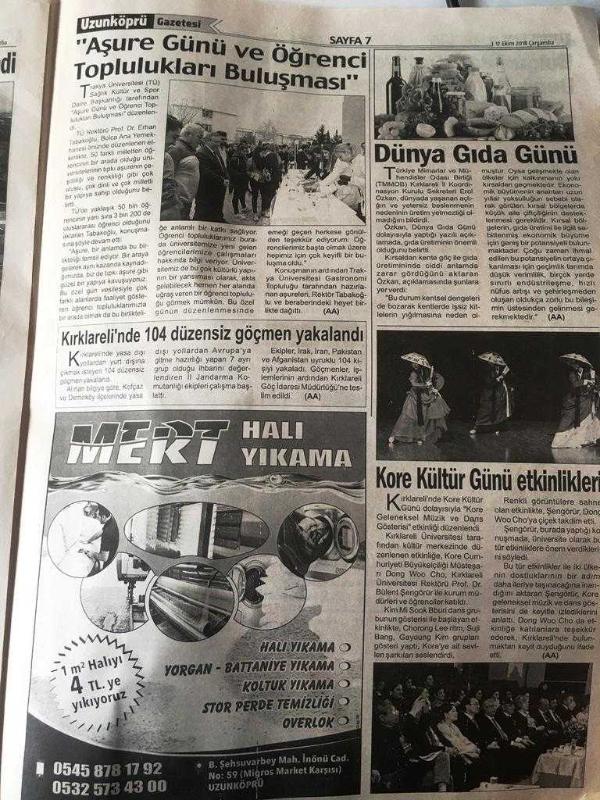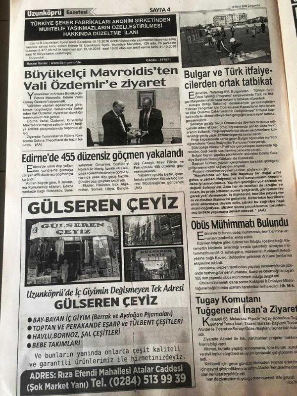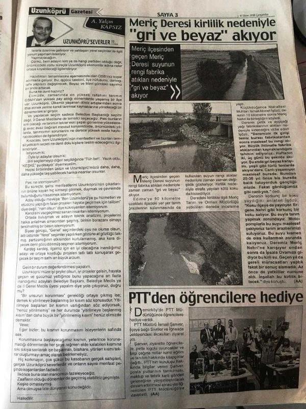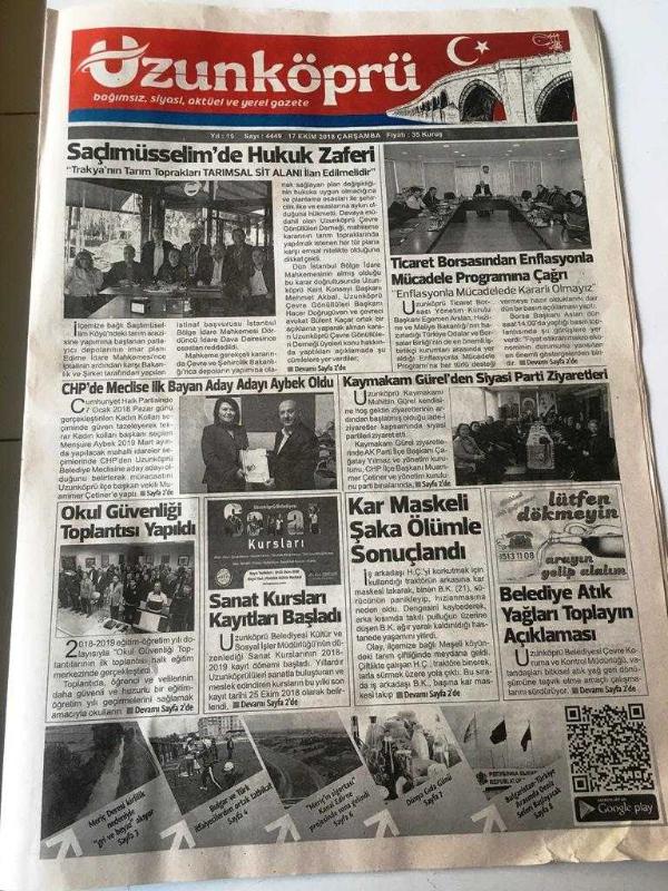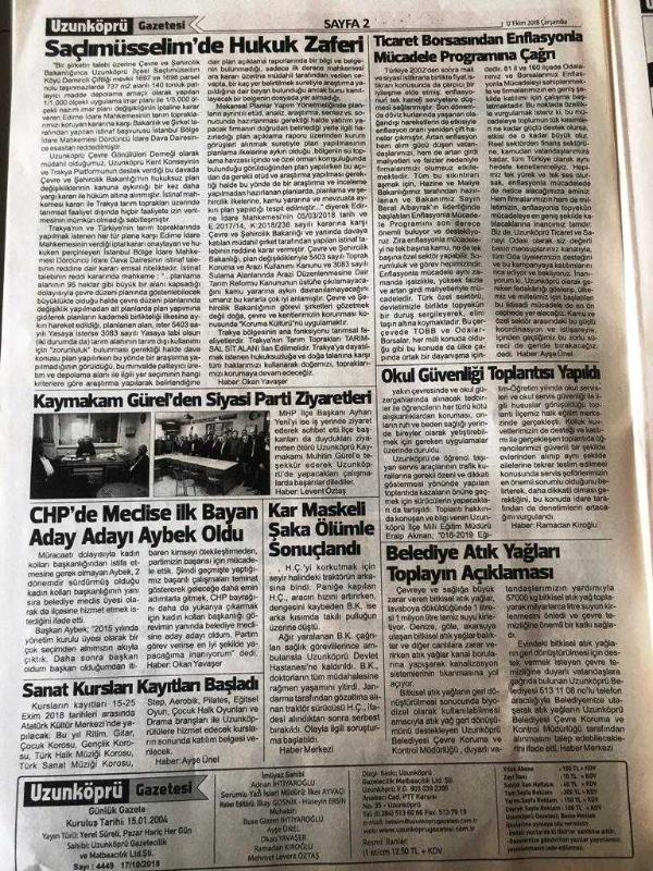 EDİRNE UZUNKÖPRÜ GAZETESİ YEREL TAŞRA BASINI - 17 EKİM 2018 YIL:15 SAYI :4449-Saçlımüsselim 'de Hukuk Zaferi - CHP ''de Meclise İlk Bayan Aday Adayı Menşure Aybek oldu - Kaymakam Gürel 'den Siyasi Parti Ziyaretleri -Meriç Deresi Kirlilik Nedeniyle Gri ve Beyaz Akıyor - Uzunköprü Severler : A. Yalçın Kapsız -Büyükelçi Mavroidis 'ten Vali Özdemir 'e Ziyaret - Edirne de 455 düzensiz göçmen yakalandı - Tugay Komutanı Tuğgeneral Turan İnan Ziyaret -Meriç 'in Sigortası Kanal Edirne Projesinde Sona Gelindi -Aşure Günü ve Öğrenci Toplulukları Buluşması - Dünya Gıda Günü - Kore Kültür Günü etkinlikleri - Bulgaristan -Türkiye Arasında Deniz Seferi Başlayacak - Büyükelçi Choi, Osmanlı mis meyve sabununa ilgi gösterdi - Yıpranma, sararmalar, kupon kesiği ve yırtılmalar zamana bağlı olarak görülebilir.