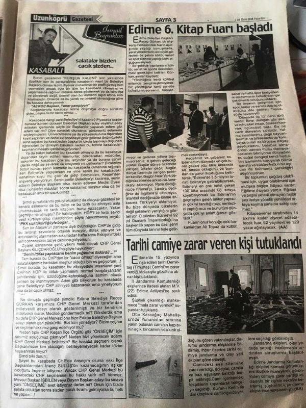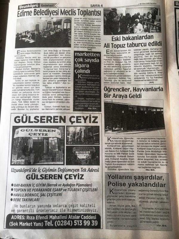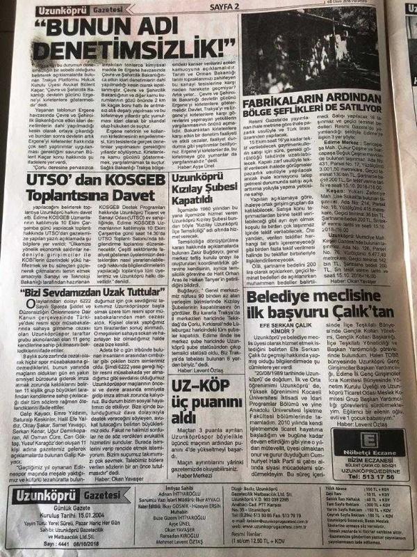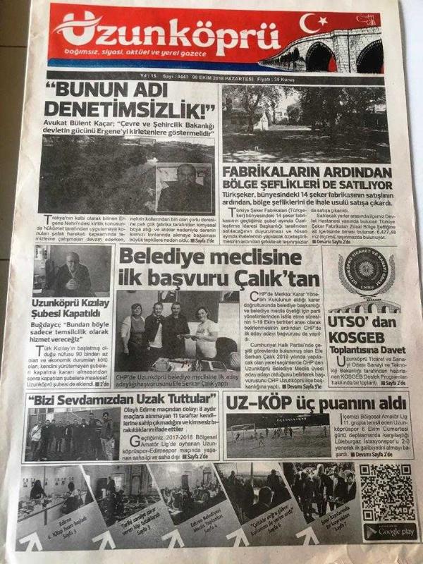 EDİRNE UZUNKÖPRÜ GAZETESİ YEREL TAŞRA BASINI -8 EKİM 2018 YIL :15 SAYI :4441- Bunun Adı Denetimsizlik Avukat Bülent Kaçar - Belediye Meclisine İlk Başvuru Çalıktan -Uzunköprü Kızılay Şubesi Kapatıldı -İsmail Bayzoktar - Edirne 6. Kitap Fuarı Başladı -Eski bakanlardan ALİ Topuz taburu edildi -Kişisel gelişim kursu törenle açıldı Fehmi Yaman ile Nazlı Aytaş kurdele keserek açılış yaptı - Yıpranma, sararmalar, kupon kesiği ve yırtılmalar zamana bağlı olarak görülebilir.