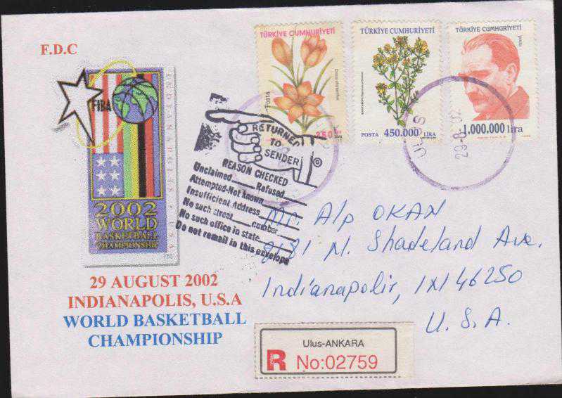 EFM.5089 2002 DÜNYA BASKETBOL ŞAMPİYONASI INDIANAPOLİS ABD. TAAHÜTLÜ AMERİKA YA GÖNDERİ İADE EDİLMİŞ, 2 yıl önce satışa sunulmuştur.