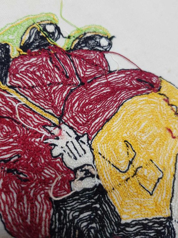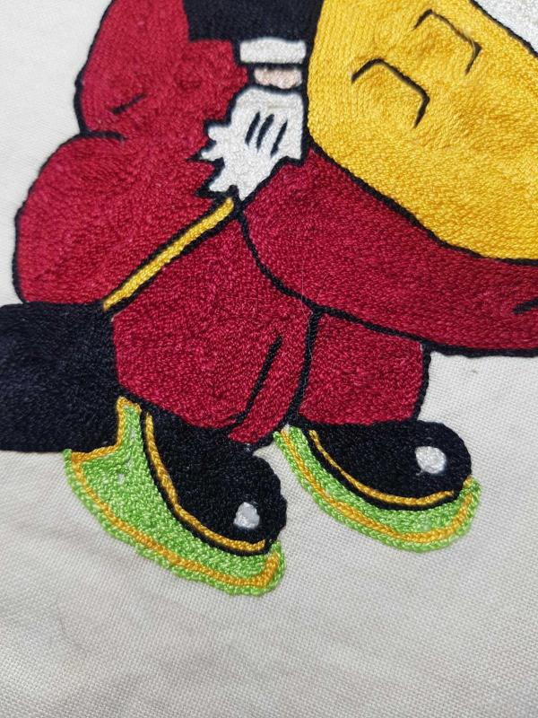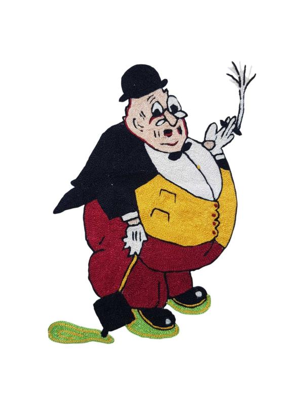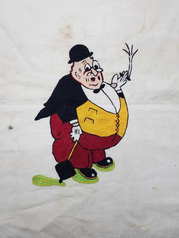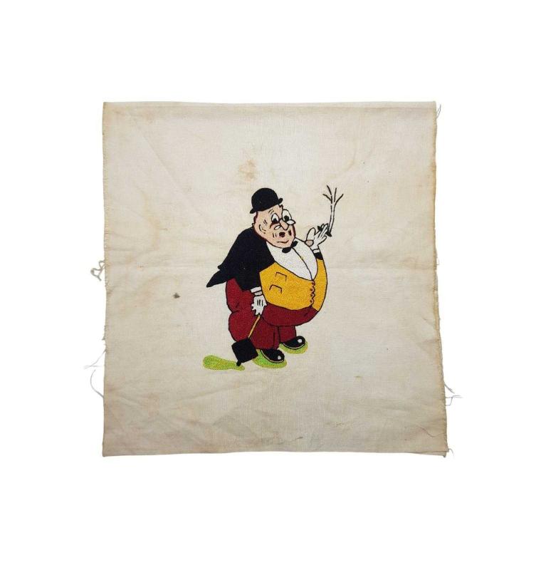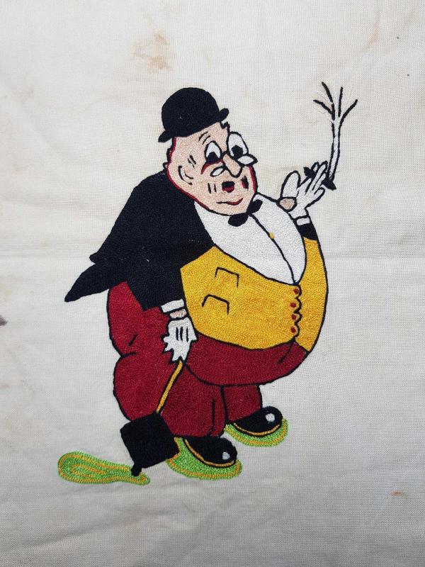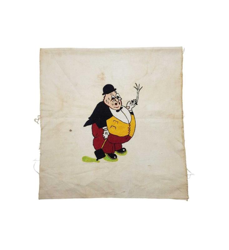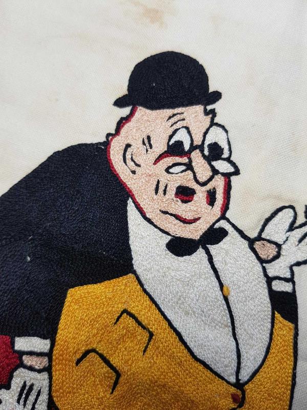 1930'LARDAN, ÜNLÜ KARİKATÜRİST CEMAL NADİR TARAFINDAN YARATILAN AMCABEY KARAKTERİNİN KUMAŞ ÜZERİNE İPEK İPLERLE İŞLENMİŞ RESMİ. EBAT: 59 X 41 CM