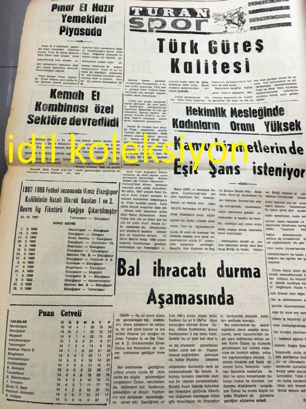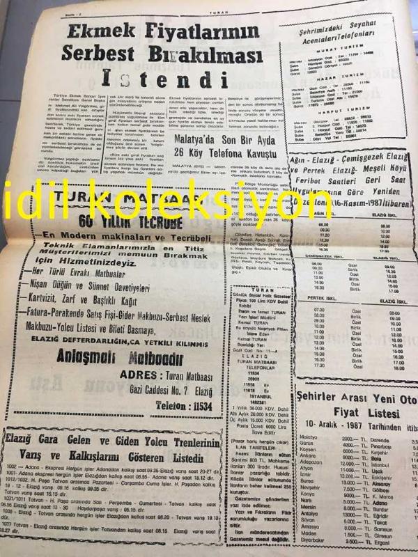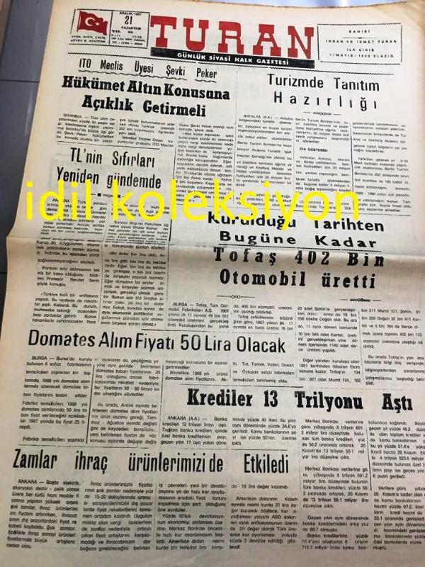 ELAZIĞ TURAN GAZETESİ YEREL TAŞRA BASINI ---21 Aralık 1987 Yıl :58 Sayı :13118--Hükümet Altın Konusuna Açıklık Getirmeli --Turizmde Tanıtım Hazırlığı --Kurulduğu Tarihten Bugüne Kadar Tofaş 402 Bin Otomobil Üretti --Domates Alım fiyatları 50 Lira Olacak --Krediler 13 Trilyon Aştı --Ekmek Fiyatlarının Serbest Bırakılması İstendi --Almanya Federal Cumhuriyeti 'nde Bir Nebze Monarşi Prens Charles ve Lady Diana Almanya Gezisinde --Hamburg da Düzenlenecek Türk Haftası 9 Nisan Tarihinde Ertelendi -- Türk Güreş Kalitesi -Hekimlik Mesleğinde Kadınların Oranı Yüksek Kamu Hizmetlerin de Eşit Şans İsteniyor --Bal ihracatı durma aşamasında Yıpranma, sararmalar, kupon kesiği ve yırtılmalar zamana bağlı olarak görülebilir.