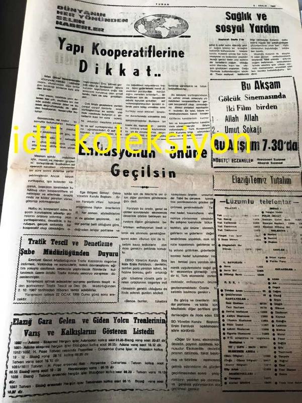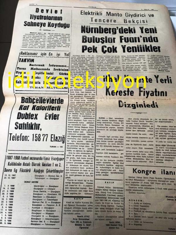 ELAZIĞ TURAN GAZETESİ YEREL TAŞRA BASINI ----9 Aralık 1987 Yıl :58 Sayı :13108--Müracaatlar 18 Ocak 1988 Günü Sona Erecek -- Optik Fiber Telekomünikasyon Yolunu Aydınlatıyor --5.Vakıf Haftası İlimizde Kutlanıyor --Milletvekillerimizden Temennim :Saim Öztürk --İslam Konferansı 2. Tarım izleme toplantı 9-12 Aralık ta İstanbul da Yapılacak --Sağlık ve Sosyal Yardım Bakanlığı 5 Adet Yürüyen Hastane Satın Alıyor --Elektrikle Manto Giydirici ve Tencere Bekçisi --Nürnberg deki yeni buluşlar fuarında pek çok yenilikler -- Yıpranma, sararmalar, kupon kesiği ve yırtılmalar zamana bağlı olarak görülebilir.