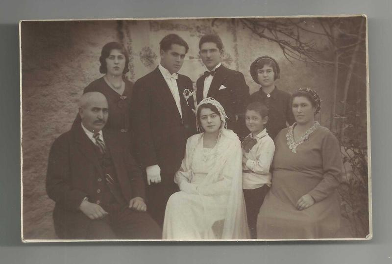 ** EMİNE'NİN NİKAH FOTOĞRAFI VE AİLESİ ARKASI OSMANLICA YAZILI ** 14 x 9 cm.ebadında,arka yüzü Osmanlıca yazılı ve imzalı, gayet iyi kondüsyonda nikah sonrası temalı aile fotoğrafı..