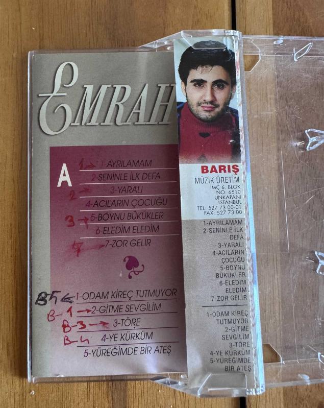 EMRAH - KLASİKLERİ - KASET 1995 - Barış Müzik A1 Ayrılamam A2 Seninle İlk Defa A3 Yaralı A4 Acıların Çocuğu A5 Boynu Bükükler A6 Eledim Eledim A7 Zor Gelir B1 Odam Kireç Tutmuyor B2 Gitme Sevgilim B3 Töre B4 Ye Kürküm B5 Yüreğimde Bir Ateş * KARTONETTE PARÇALARIN YANINA RAKAMLAR YAZILMIŞ (3. GÖRSEL), TAMAMI DİNLENİLDİ, SORUNSUZ.