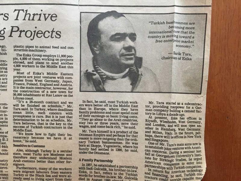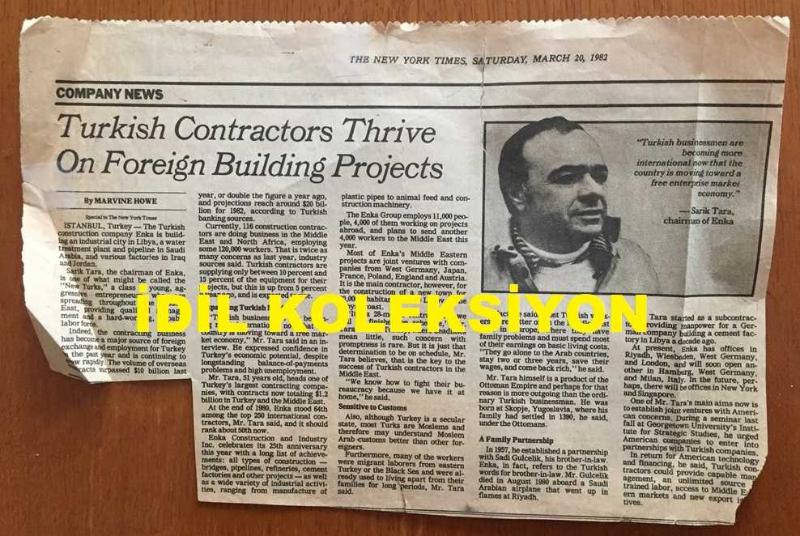 ENKA ŞİRKETLER GRUBU FAHRİ BAŞKANI ŞARIK TARA'NIN THE NEW YORK TIMES GAZETESİNDEN FOTOĞRAF ve HABERİNİN YER ALDIĞI ORİJİNAL SAYFA KÜPÜRÜ - 29 x 20 cm EBADINDA - ORTADOĞU'DA FAALİYET GÖSTEREN 100 DEV İNŞAAT ŞİRKETİ ARASINDA ENKA DA YER ALIYOR, 20 MART 1982 TARİHLİ HABER (GAZETE DÖNEMİNE AİT ORİJİNAL BASKIDIR, FOTOKOPİ DEĞİL!), en son 6 ay önce güncellenmiştir.