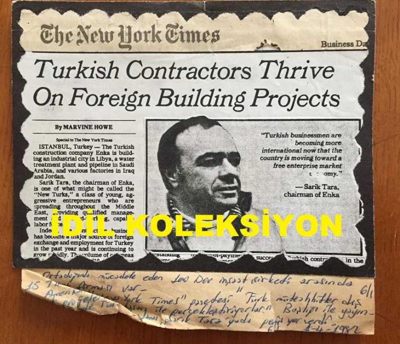 ENKA ŞİRKETLER GRUBU FAHRİ BAŞKANI ŞARIK TARA'NIN THE NEW YORK TIMES GAZETESİNDEN FOTOĞRAF ve HABERİNİN YER ALDIĞI SAYFA KÜPÜRÜ - 18 x 16 cm EBADINDA - ORTADOĞU'DA FAALİYET GÖSTEREN 100 DEV İNŞAAT ŞİRKETİ ARASINDA ENKA DA YER ALIYOR, 20 MART 1982 TARİHLİ HABER (GAZETE DÖNEMİN AJANSI TARAFINDAN FOTOKOPİ EDİLİP KARTONA YAPIŞTIRILMIŞTIR), en son 6 ay önce güncellenmiştir.