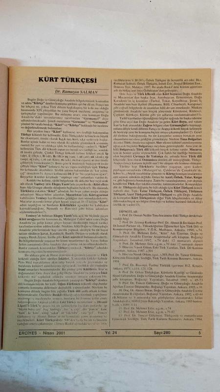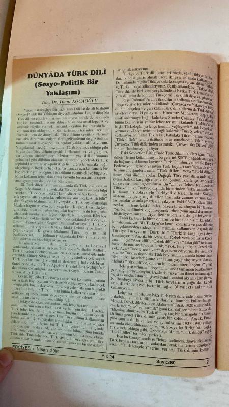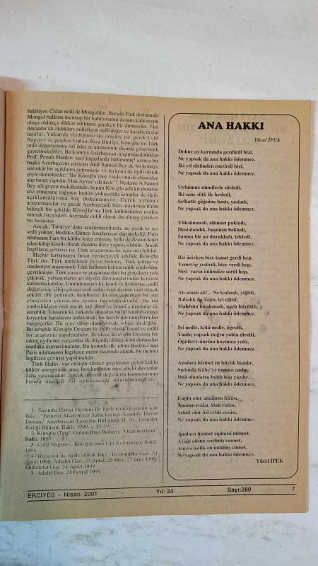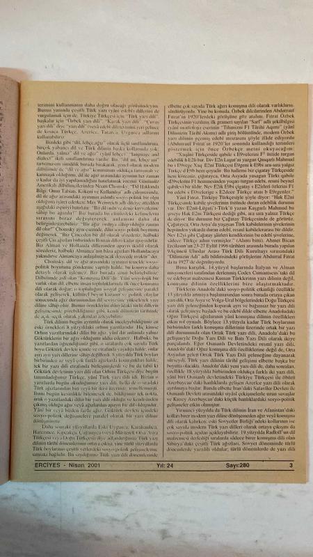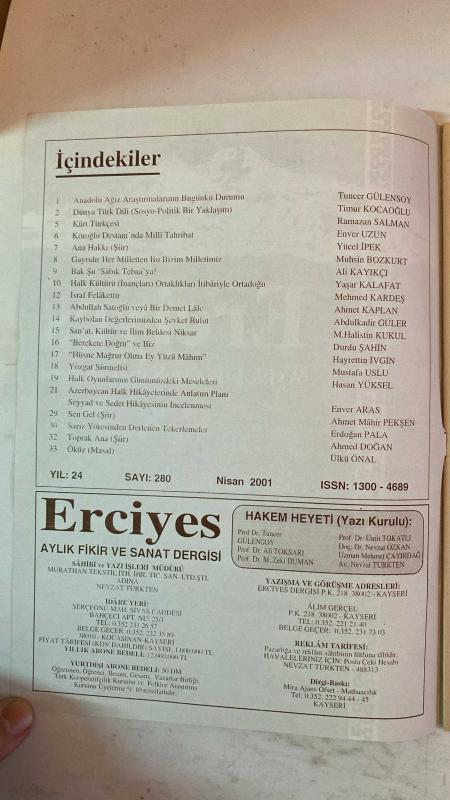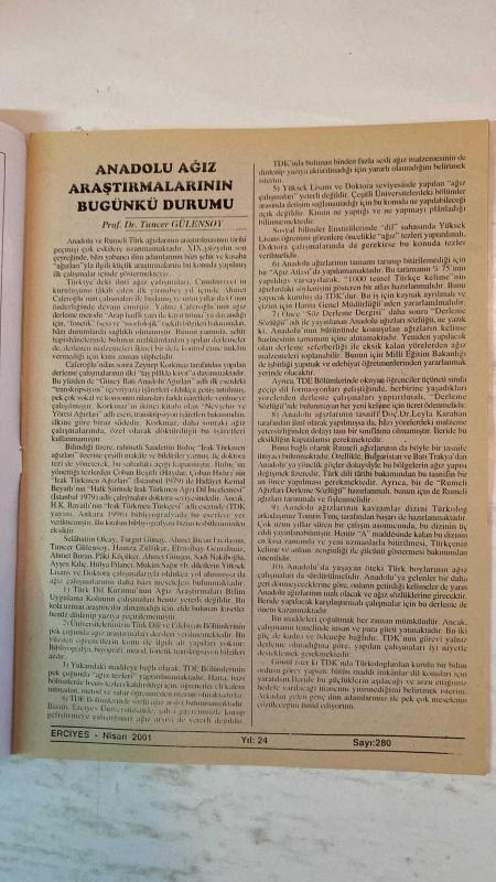 ERCİYES AYLIK FİKİR VE SANAT DERGİSİ - YIL: 24 SAYI: 280 TARİH: NİSAN 2001 TUNCER GÜLENSOY - TIMUR KOCAOĞLU - RAMAZAN SALMAN - ENVER UZUN - YÜCEL İPEK - MUHSİN BOZKURT - ALİ KAYIKÇI - YAŞAR KALAFAT - MEHMED KARDEŞ - AHMET KAPLAN - ABDULKADİR GÜLER - M. HALİSTİN KUKUL - DURDU ŞAHİN - HAYRETTİN İVGİN - MUSTAFA USLU - HASAN YÜKSEL - ENVER ARAS - AHMET MÂHİR PEKSEN - ERDOĞAN PALA - AHMET DOĞAN - ÜLKÜ ÖNAL ANADOLU AĞIZ ARAŞTIRMALARININ BUGÜNKÜ DURUMU - DÜNYA TÜRK DİLİ (SOSYO-POLİTİK BİR YAKLAŞIM) - KÜRT TÜRKÇESİ - BAK ŞU SÂBIK TEBAA’YA - KÖROĞLU DESTANI’NDA MİLLÎ TAHRİBAT - ANA HAKKI - GAYRIDIR HER MİLLETTEN BU BİZİM MİLLETİMİZ - HALK KÜLTÜRÜ (İNANÇLARI) ORTAKLIKLARI İTİBARIYLA ORTADOĞU - İSRAF FELAKETTİR - ABDULLAH SATOĞLU VEYÂ BİR DEMET LÂLE - KAYBOLAN DEĞERLERİMİZDEN ŞEVKET BULUT - SAN’AT, KÜLTÜR VE İLİM BELDESİ NİKSAR - “BEREKETE DOĞRU” VE BİZ - “HÜSNE MAĞRUR OLMA EY YÜZÜ MÂHIM” - YOZGAT SÜRMELİSİ - HALK OYUNLARININ GÜNÜMÜZDEKİ MESELELERİ - AZERBAYCAN HAL - TAM TAKIM EKSİKSİZ 34 SAYFA, NEVZAT TÜRKTEN tarafından kaleme alınmıştır. Eser ALİM GERÇEL editörlüğünde hazırlanmıştır. ERCİYES AYLIK FİKİR VE SANAT DERGİSİ - YIL: 24 SAYI: 280 TARİH: NİSAN 2001 TUNCER GÜLENSOY - TIMUR KOCAOĞLU - RAMAZAN SALMAN - ENVER UZUN - YÜCEL İPEK - MUHSİN BOZKURT - ALİ KAYIKÇI - YAŞAR KALAFAT - MEHMED KARDEŞ - AHMET KAPLAN - ABDULKADİR GÜLER - M. HALİSTİN KUKUL - DURDU ŞAHİN - HAYRETTİN İVGİN - MUSTAFA USLU - HASAN YÜKSEL - ENVER ARAS - AHMET MÂHİR PEKSEN - ERDOĞAN PALA - AHMET DOĞAN - ÜLKÜ ÖNAL ANADOLU AĞIZ ARAŞTIRMALARININ BUGÜNKÜ DURUMU - DÜNYA TÜRK DİLİ (SOSYO-POLİTİK BİR YAKLAŞIM) - KÜRT TÜRKÇESİ - BAK ŞU SÂBIK TEBAA’YA - KÖROĞLU DESTANI’NDA MİLLÎ TAHRİBAT - ANA HAKKI - GAYRIDIR HER MİLLETTEN BU BİZİM MİLLETİMİZ - HALK KÜLTÜRÜ (İNANÇLARI) ORTAKLIKLARI İTİBARIYLA ORTADOĞU - İSRAF FELAKETTİR - ABDULLAH SATOĞLU VEYÂ BİR DEMET LÂLE - KAYBOLAN DEĞERLERİMİZDEN ŞEVKET BULUT - SAN’AT, KÜLTÜR VE İLİM BELDESİ NİKSAR - “BEREKETE DOĞRU” VE BİZ - “HÜSNE MAĞRUR OLMA EY YÜZÜ MÂHIM” - YOZGAT SÜRMELİSİ - HALK OYUNLARININ GÜNÜMÜZDEKİ MESELELERİ - AZERBAYCAN HAL - TAM TAKIM EKSİKSİZ 34 SAYFA adlı eser Türkçe dilindedir.