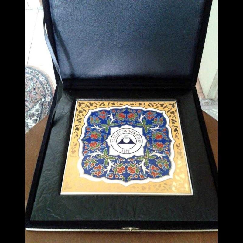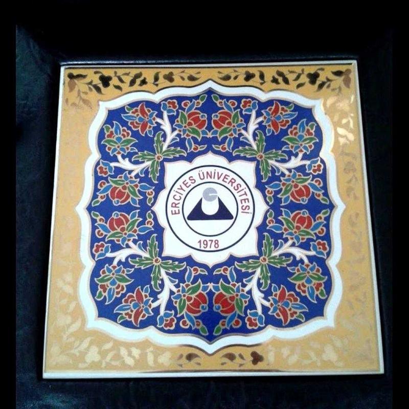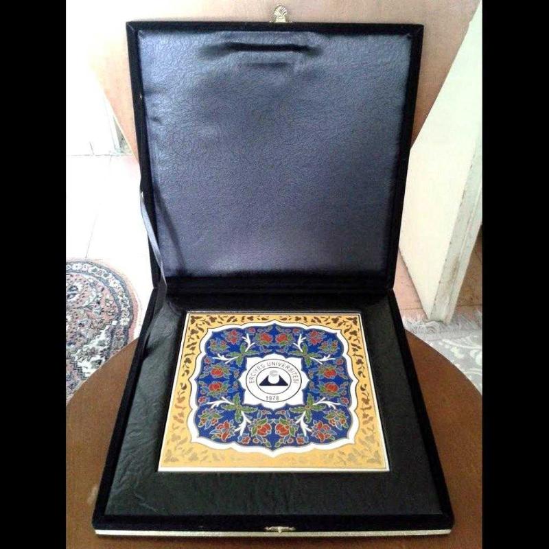 ERCİYES ÜNİVERSİTESİ HATIRA ÇİNİ.. Erciyes Üniversitesi Hatıra Çinisi.Altın desenli, Logolu, Siyah Kadife Kutuda,çok temiz kusursuz. Çini,20x20cm ebadında. Kutu,30x30 ebadında.Kütahya Çini.. Çekimden kaynaklı renk farkı oluşmaktadır.