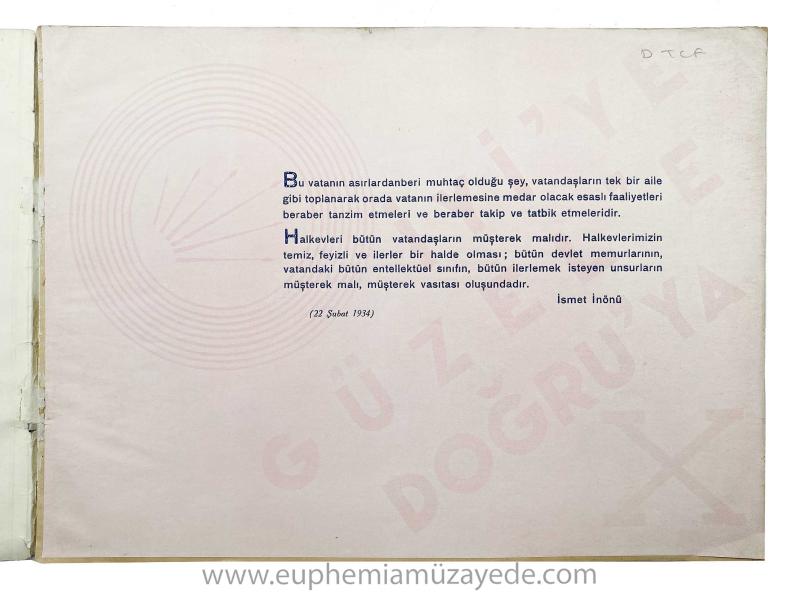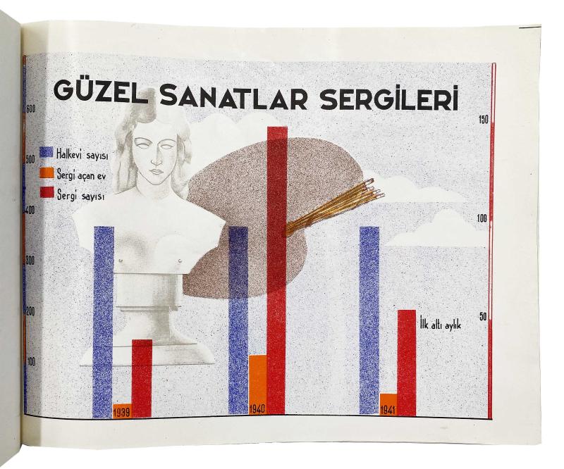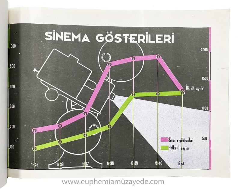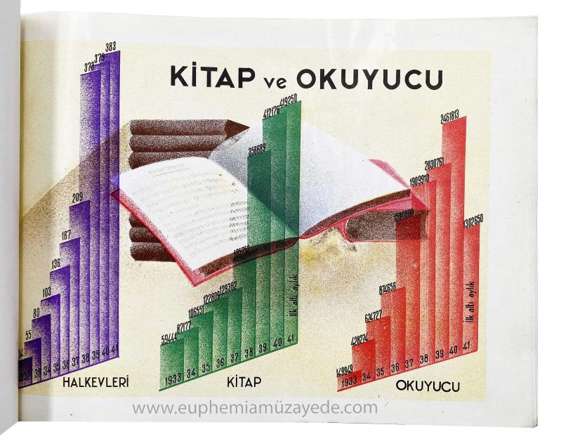 ERKEN CUMHURİYET GÖRSEL HAFIZASI İLE CUMHURİYET AYDINLANMASININ GRAFİKLERİ C.H.P. Halkevleri-Halkodaları 1932-1942, Cumhuriyet Halk Partisi, Alâeddin Kıral Basımevi, 1942. Özgün karton kapağında, kapak sırtında yıpranma mevcut, harici çok temiz durumda, 32 x 23 cm, 28, [30] sayfa, renkli grafik sayfaları. Otuz sayfa renkli grafik bölümü vardır. "Data görselleştirme" açısından Cumhuriyet Türkiyesi'nin ilk eserlerinden biridir. Çok çok nadir. Cumhuriyet Halk Partisi'nin, yurt içinde inkılâp ve sosyal ilerleme hamlelerini ve hareketlerini daimi surette ayakta tutmak ve geliştirmek maksadı ile kurduğu Halkevleri bu yıl onun yaşına yetişmiş bulunuyor. Gerçekten, ilk Halkevi 1932 yılında kurulduğuna göre aradan 10 yıl geçmiştir. Diğer kardeşlerine ağabeylik etmiş bu ilk Halkevleri'nin adlarını burada tekrar edelim: Afyon, Ankara, Aydın, Bolu, Bursa, Çanakkale, Denizli, Diyarbakır, Eminönü, Eskişehir, İzmir, Konya, Malatya, Samsun. 1932 yılının Şubatında açılan bu Halkevlerinden sonra, bir yandan Parti'nin, bir yandan da mahalli istek ve ihtiyaçların intizam ile her yıl yenileri açılmak suretiyle bu kurumların sayıları arttı. 1940 yılından beri açılmaya başlanan Halkodaları ile birlikte bu kurumlar memleketin her bucağına yayılan hayırlı birer kültür müessesi oldular.