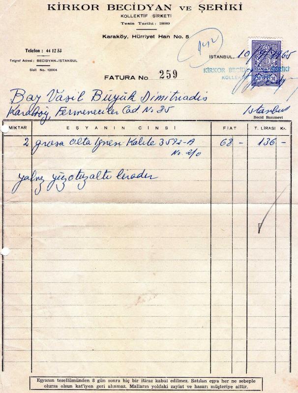 ERMENİ EVRAK .FATURA KİRKOR BECİDYAN BAY VASİL BÜYÜKDİMİTRİADİES, 3 yıl önce satışa sunulmuştur.