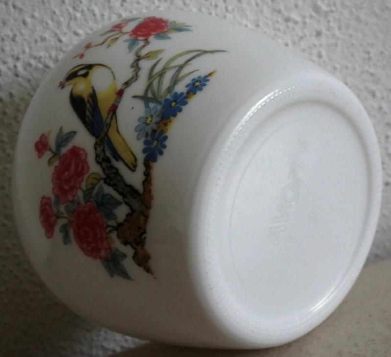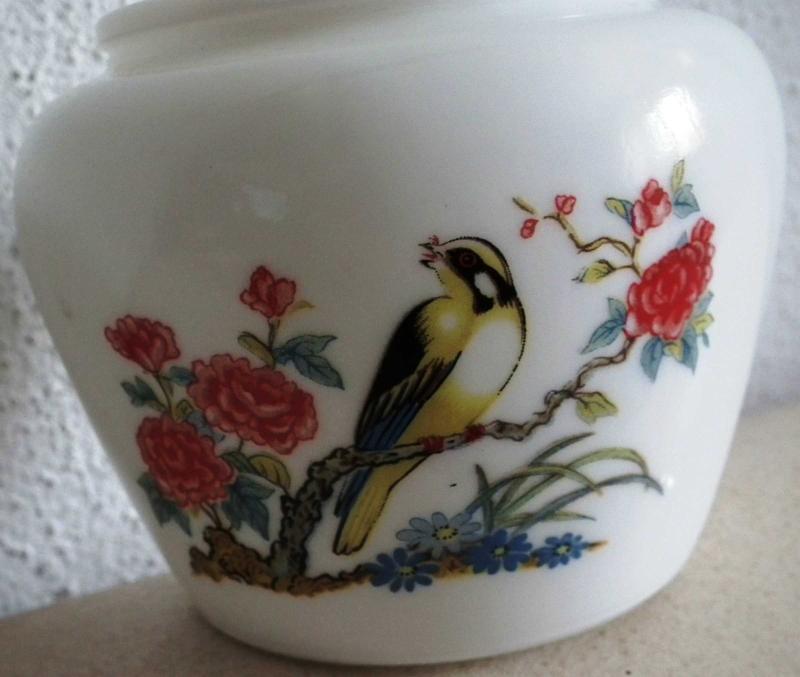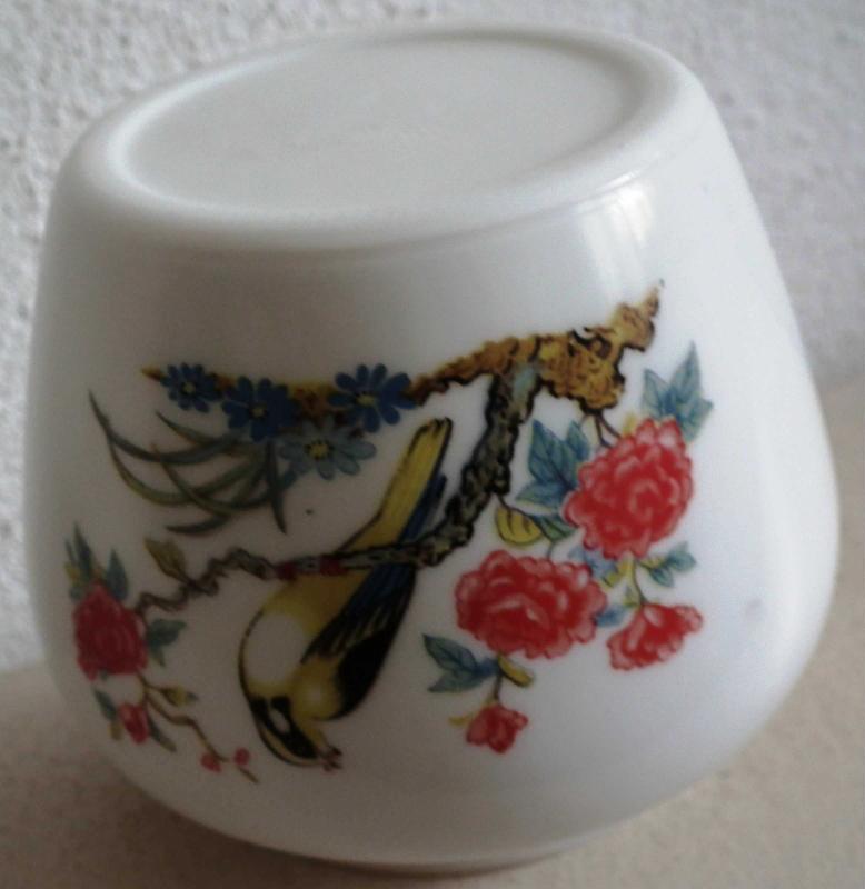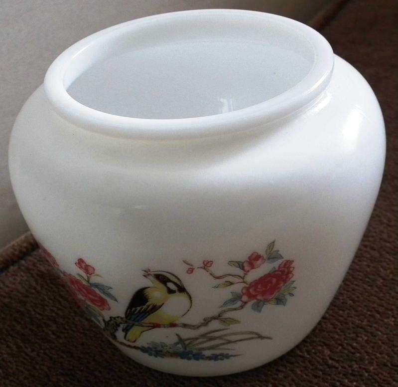 ÇİÇEKLİ KUŞLU BEYAZ OPALİN ŞEKERLİK KASE KAPAKSIZ BOY 10 CM ÇAP 8 CM ESKİ AVON KAVANOZ