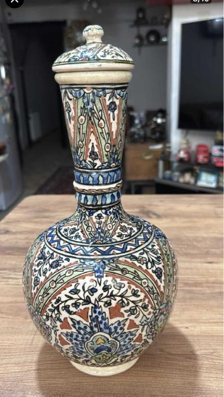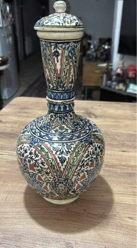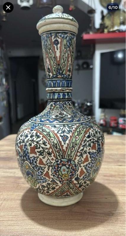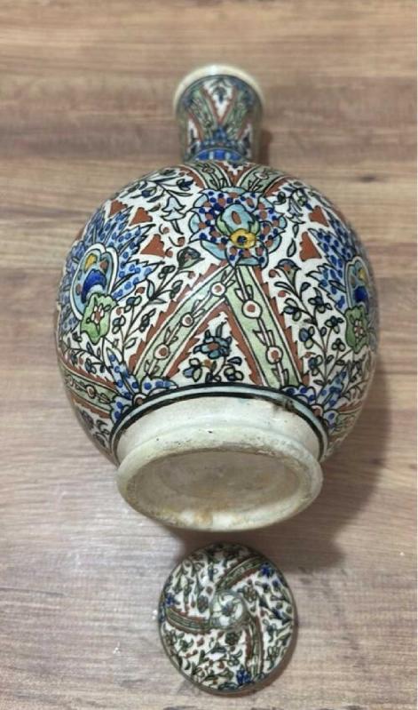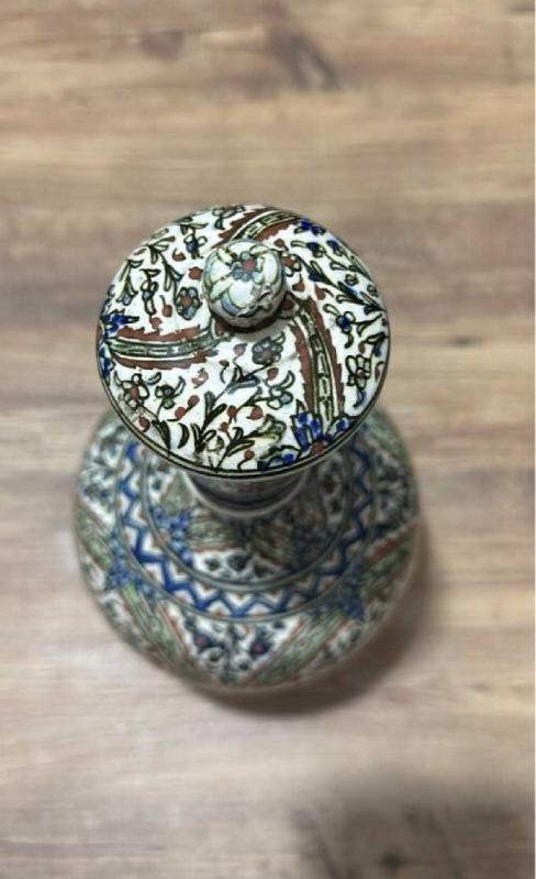 ESKİ DEKORLUK KÜTAHYA ÇİNİ ŞİŞE SÜRAHİ Dışa dönük düz ağızlı, pedestal ayaklı, küresel gövdeli ve kapaklı şişenin yüzeyi kobalt mavi, yeşil, sarı, kiremit kırmızısı ve turkuaz ile hayati, şakayık, sümbül, mine ve rozet çiçekleri ile dekorlu. Dönem: 20. yüzyıl sonları Yükseklik 34 cm, 11 gün önce kitantik’te satışa sunulmuştur.