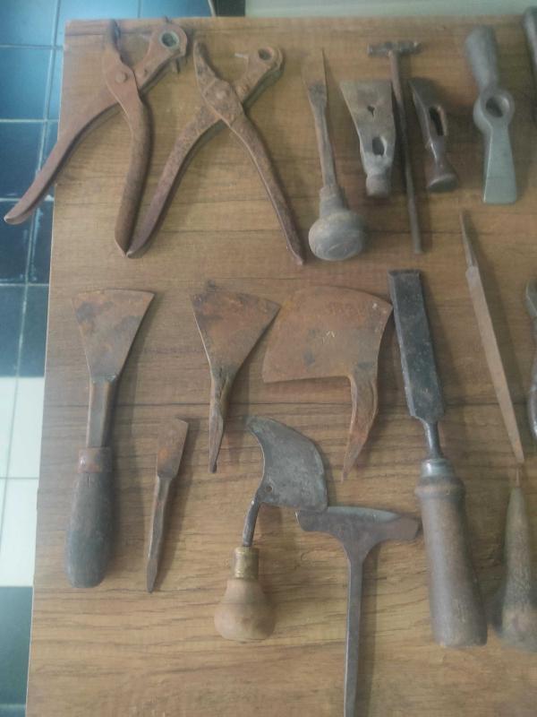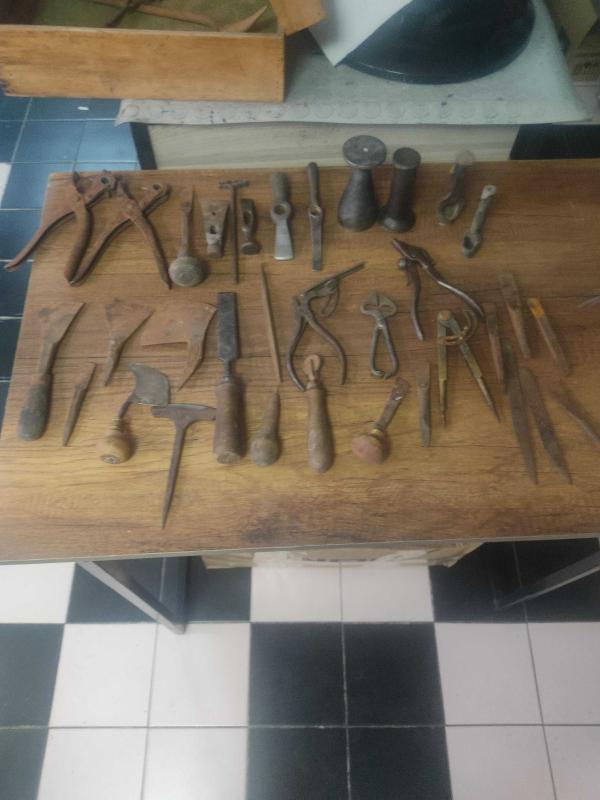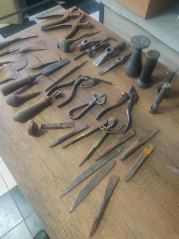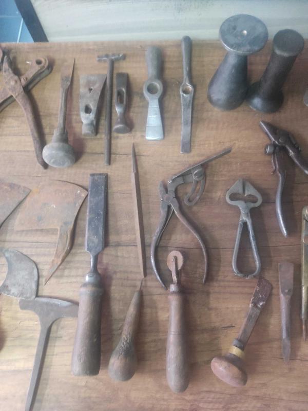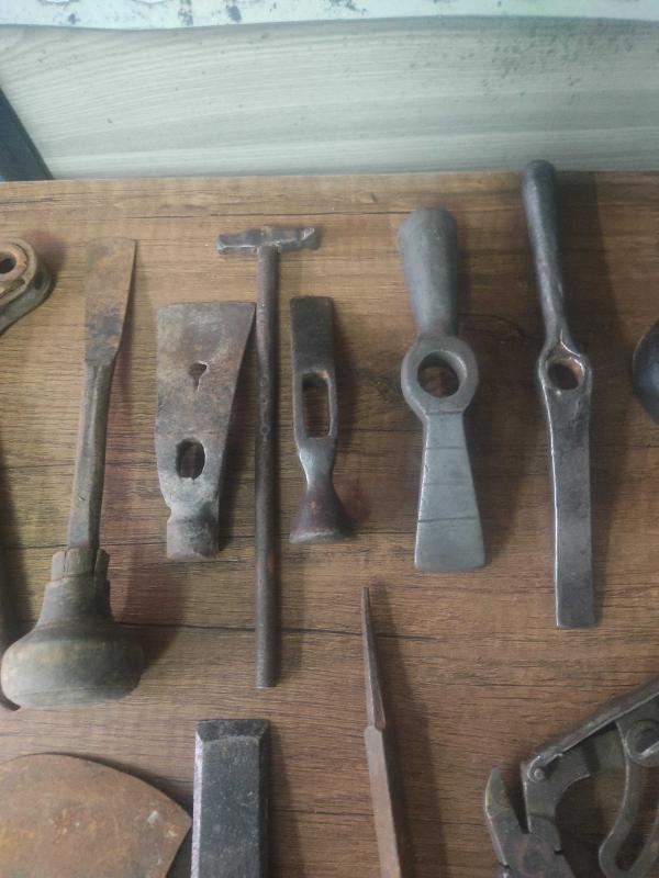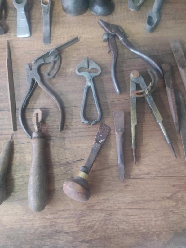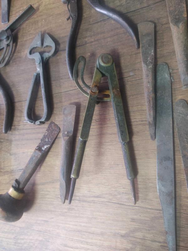 Hepsi tek sandıktan çıkma saraciye el aletleri. Özellikle çekiçlerin formları çok ilginç. Mini örslerde öyle. Pergel pirinç. Toplam 34 parça.