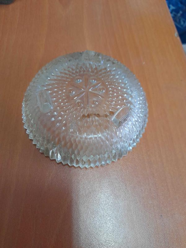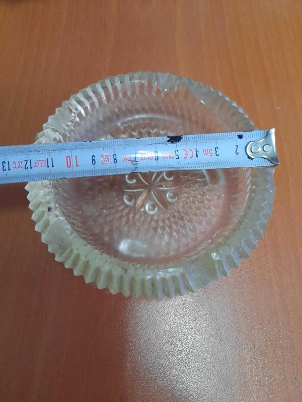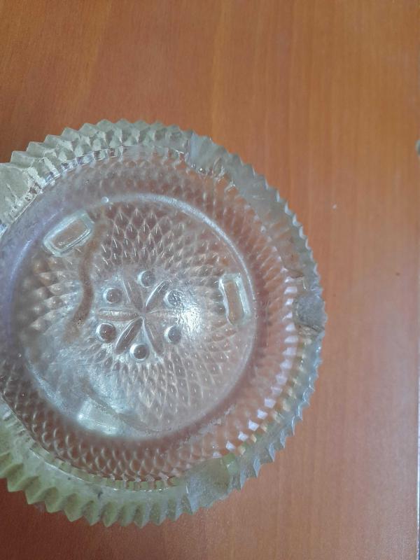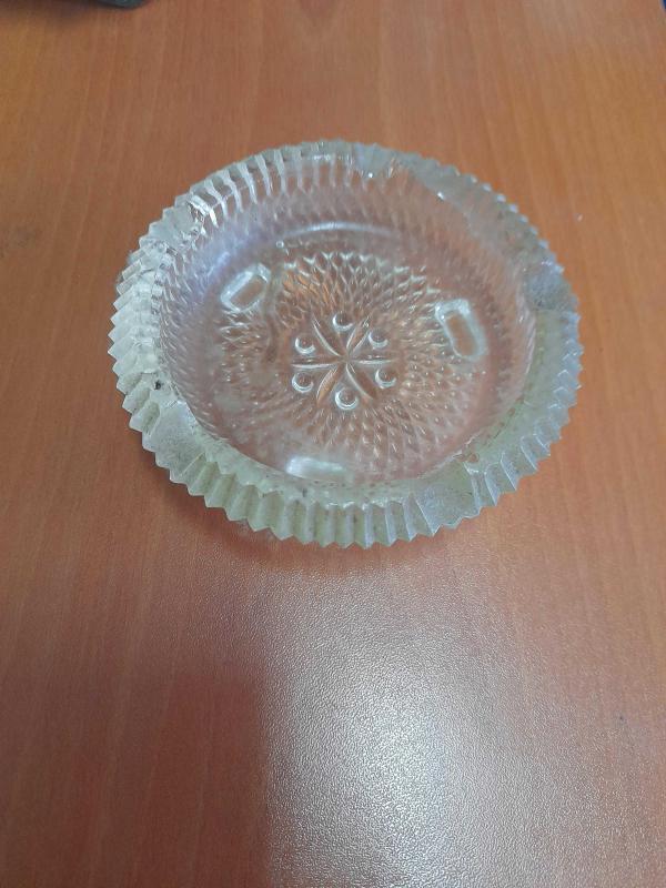 12 cm genişliğinde 4 cm yüksekliğinde eski cam kül tablası kenarda belli olmayan atık vardır