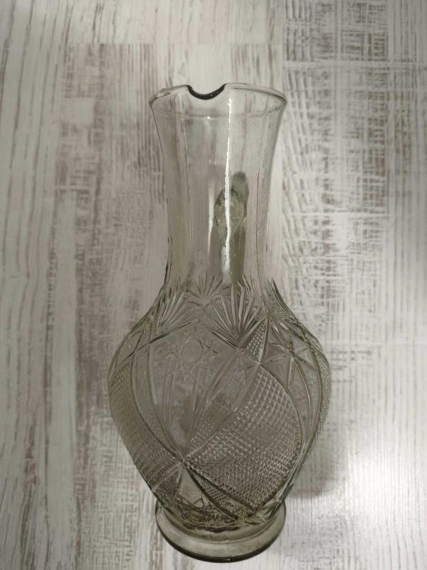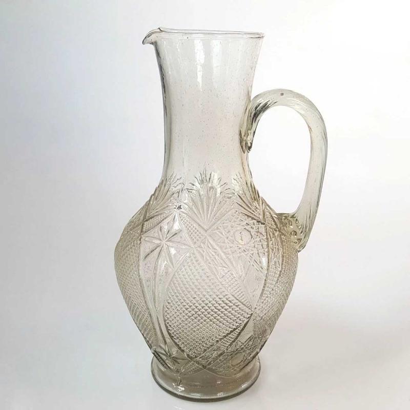 Kristal kesme görüntülü kalıp cam sürahi, doğal cam renginde. Yivli sapı üfleme yöntemiyle elde üretilip kalıp gövdeye monte edilmiş. 26 cm uzunlukta, 14 cm en geniş yerinin çapı. Altında KARTAL CAM kabartma harfleri var. Her sofraya ışıltı getireceği kesin.