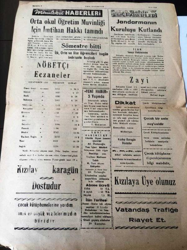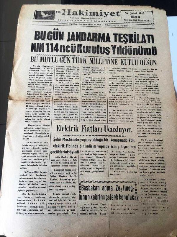 ESKİŞEHİR YENİ HAKİMİYET GAZETESİ YEREL TAŞRA BASINI ---16 Şubat 1960 Yıl :7 Sayı :1862--Bugün jandarma teşkilatının 114 . kuruluş yıldönümü bu mutlu gün Türk Milletine Kutlu Olsun --Elektrik Fiyatları Ucuzluyor --Orta okul öğretim Muavinliği İçin imtihan hakkı tanındı -- Jandarmanın Kuruluşu Kutlandı - Yıpranma, sararmalar, kupon kesiği ve yırtılmalar zamana bağlı olarak görülebilir.