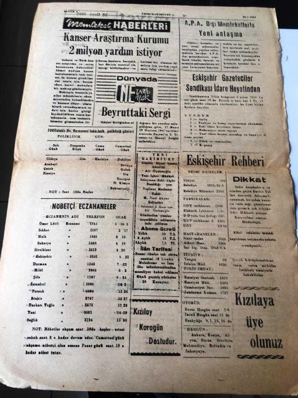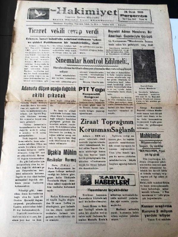 ESKİŞEHİR YENİ HAKİMİYET GAZETESİ YEREL TAŞRA BASINI ---28 Ocak 1960 Yıl :7 Sayı :1847--Ticaret Vekili Cevap Verdi --Erkmen ,İsmet İnönü 'nün Suistimal İddiasına yılıcı ve şiddet politikasının bir tezahürüdür --Sinemalar Kontrol Edilmeli ---Adana da düşen uçağa dağcılık ekibi çıkacak - Uçakla Mühim Vesikalar Varmış - PTT Yapı Kooperatifi Kongresi -Ziraat Toprağının Korunması Sağlandı - Başvekil Adnan Menderes Bir Amerikalı Gazeteciyle Görüştü --Mahkumlar : Müsamerelerini başarı ile verdiler -Ben Masumum piyesi çok ilgi gördü --Kanser Araştırma Kurumu 2 Milyon Yardım İstiyor - APA Dışı Memleketlerle Yeni Anlaşma--Eskişehir Gazeteciler Sendikası İdare Heyetinden -- Yıpranma, sararmalar, kupon kesiği ve yırtılmalar zamana bağlı olarak görülebilir.