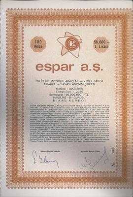 ESPAR A.Ş. Hisse Senedi başlıklı ürün, Efemera, Müzik, Sinema > Belge ve Evraklar > Finansal Belge ve Evrak > Eski Hisse Senedi, Tahvil > Cumhuriyet Dönemi kategorisi altında İkinci El olarak satılmaktadır.