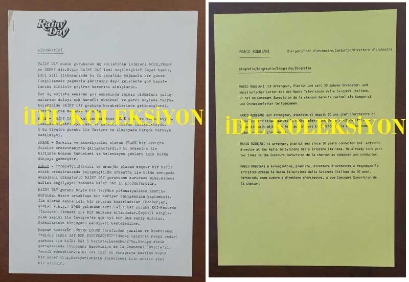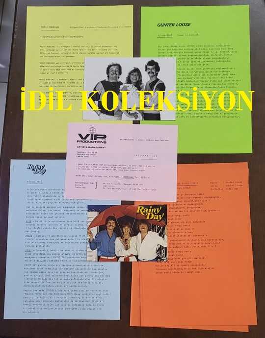 EUROVISION 1984 ŞARKI YARIŞMASI'NA KATILAN İSVİÇRE'Lİ MÜZİK GRUBU RAINY DAY'İN TÜRKİYE'YE GÖNDERDİĞİ FOTOĞRAFLI TANITIM BROŞÜRÜ SETİ - 1 ADET FOTOĞRAF, 1 ADET KARTOSTAL, 6 YAPRAK TANITIM, BİYOGRAFİ SAYFASI ve BEYAZ KLASÖR - FOTOĞRAF 17,5 x 12,5 cm EBADINDA - SAYFALAR 29 x 21 cm RENKLİ BASIM - KARTPOSTAL 14,5 x 10,5 cm - A SET OF PHOTO BROCHURES SENT TO TURKEY BY THE SWISS MUSIC GROUP RAİNY DAY, WHO PARTICIPATED IN THE EUROVISION SONG CONTEST 1984., en son bir saat önce güncellenmiştir.
