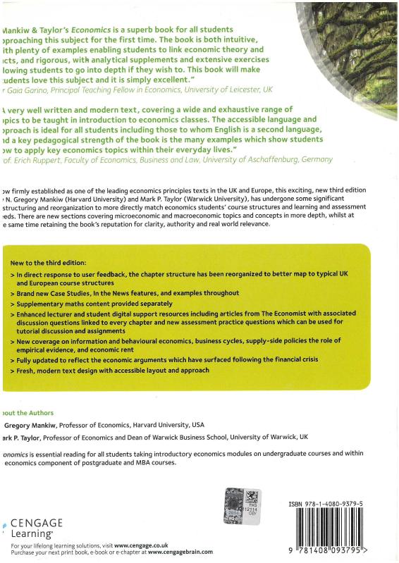Economics Gregory Mankiw & Mark Taylor, N. Gregory Mankiw & Mark P. Taylor tarafından kaleme alınmıştır. Kitap 2014 yılında CENGAGE LEARNING tarafından [UK] yayınlanmıştır. Satışta olan kitap, yayınevinin 3. baskısıdır. 820 sayfadır. Economics Gregory Mankiw & Mark Taylor adlı eser İngilizce dilindedir.