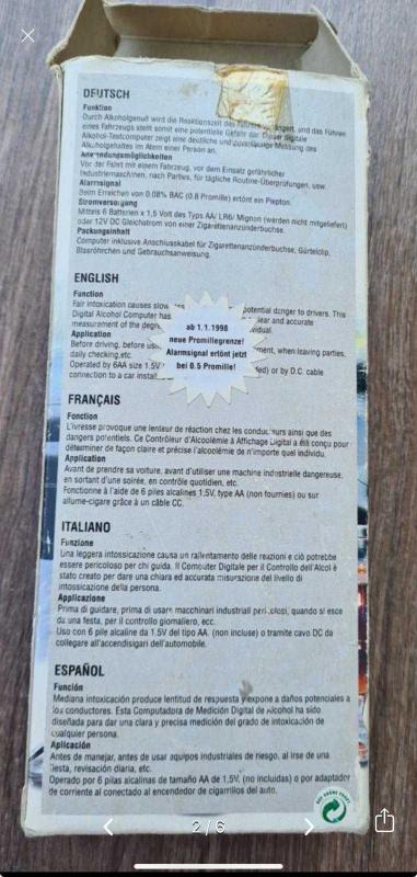 Ecuform marka “Digital Alkohol Computer” dijital alkol ölçer. Orijinal kutusu, kullanım kılavuzu, çakmaklık kablosu ve yedek ağızlıklarıyla beraber satılmaktadır. Marka / Model: Ecuform – Digital Alkohol Computer Menşei: Almanya (MTR Medizinische Technik GmbH, Offenbach am Main) Dönem: 1990’lar sonu – 2000’ler başı vintage elektronik Ekran: Kırmızı LED dijital gösterge (%BAC) Çalışma şekli: 6 adet AA (1,5V) pil veya araç çakmaklığı üzerinden Kutusunda: Cihaz, araba çakmaklık kablosu, ağızlık seti, çok dilli (DE/EN/FR/IT/ES) açıklama, dış kutu Durum: Cihaz gövdesi temiz, tuşlar ve kapaklar sağlam. Dış kutuda yaşa bağlı yıpranma, ezik ve bant izleri mevcut. Çalışır durumdadır. Fotoğraflar ilandaki ürünün kendisine aittir, inceleyiniz. Kullanım / Koleksiyon: Eski tip dijital alkolmetre arayanlar, Tıp tarihi, otomotiv aksesuarı veya elektronik ölçüm cihazı koleksiyonerleri, Retro/vintage vitrin dekorasyonu yapmak isteyenler için ideal bir parça.