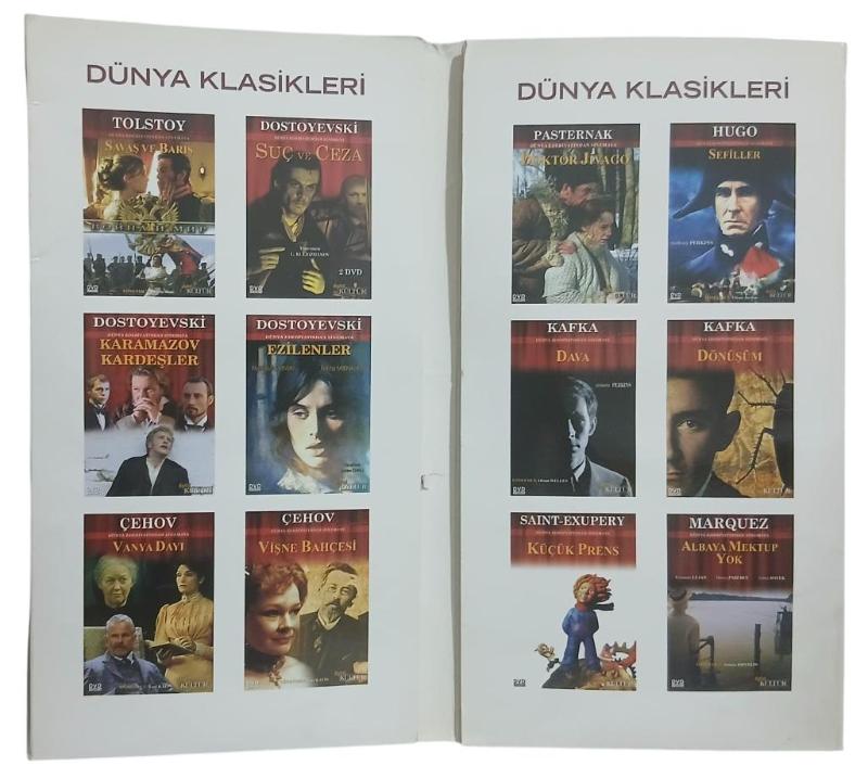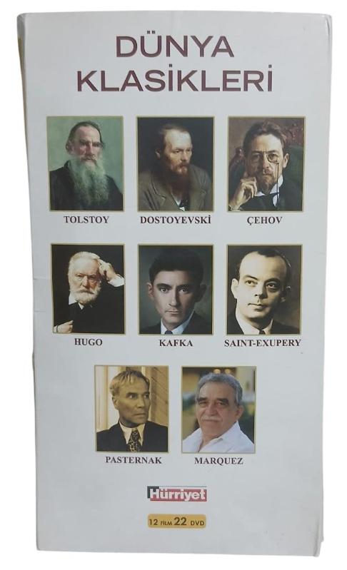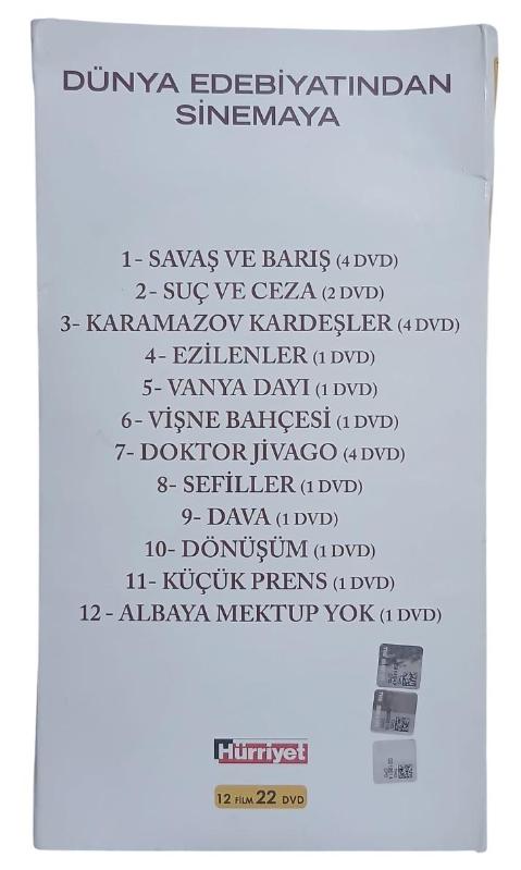 Edebiyat Eserlerinden Dünya Sinemasına Set 4 (22 Dvd 12 Film)... Dünya Edebiyatından en çok okunan klasikleşmiş 12 kitaptan sinemaya uyarlanmış muhteşem 12 film.Hepsi orijinal.Piyasada nadir bulunan filmler.Filmler arşiv için alınmış,hiç kullanılmamıştır.Ancak resimdeki karton kutuda olduğu için taşınma esnasında biraz kartona sürtünmüştür.Herhangi bir sıkıntısı yada göstermesine engel bir durumu yoktur.Oldukça iyi durumdadır. Filmler: *Savaş ve Barış 4 Dvd *Suç ve Ceza 2 Dvd *Karamazov Kardeşler 4 Dvd *Ezilenler 1 Dvd *Vanya Dayı 1 Dvd *Vişne Bahçesi 1 Dvd *Doktor Jivago 4 Dvd *Sefiller 1 Dvd *Dava 1 Dvd *Dönüşüm 1 Dvd *Küçük Prens 1 Dvd *Albaya Mektup Yok 1 Dvd