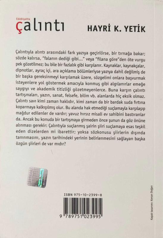 Edebiyatta Çalıntı, Hayri K. Yetik tarafından kaleme alınmıştır. Kitap 2005 yılında İnkılap Kitabevi tarafından [İstanbul] 9789751023995 ISBN kodu ile yayınlanmıştır. Edebiyatta Çalıntı adlı eser Türkçe dilindedir.
