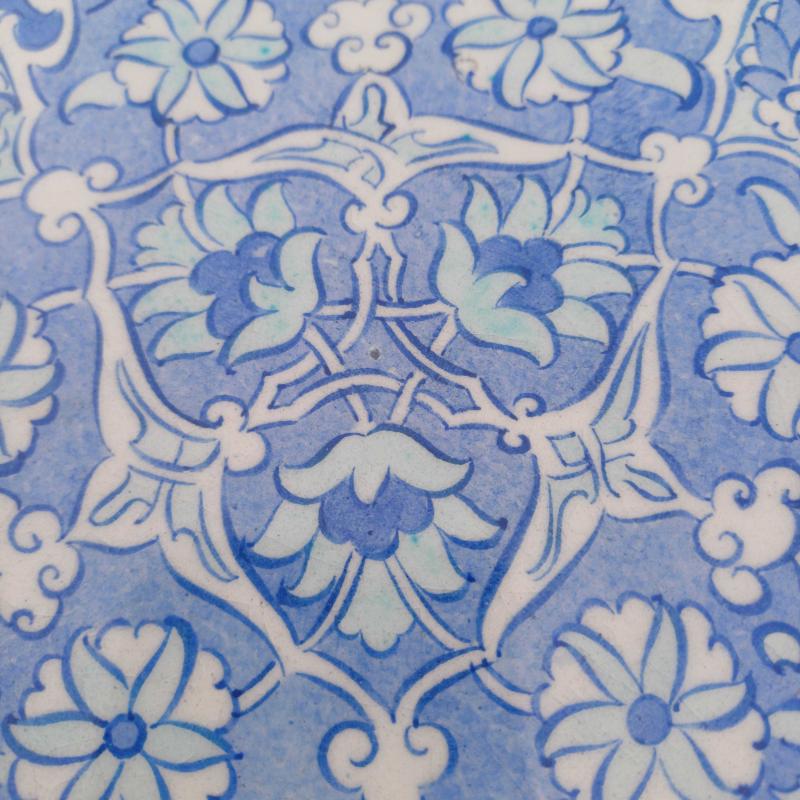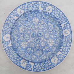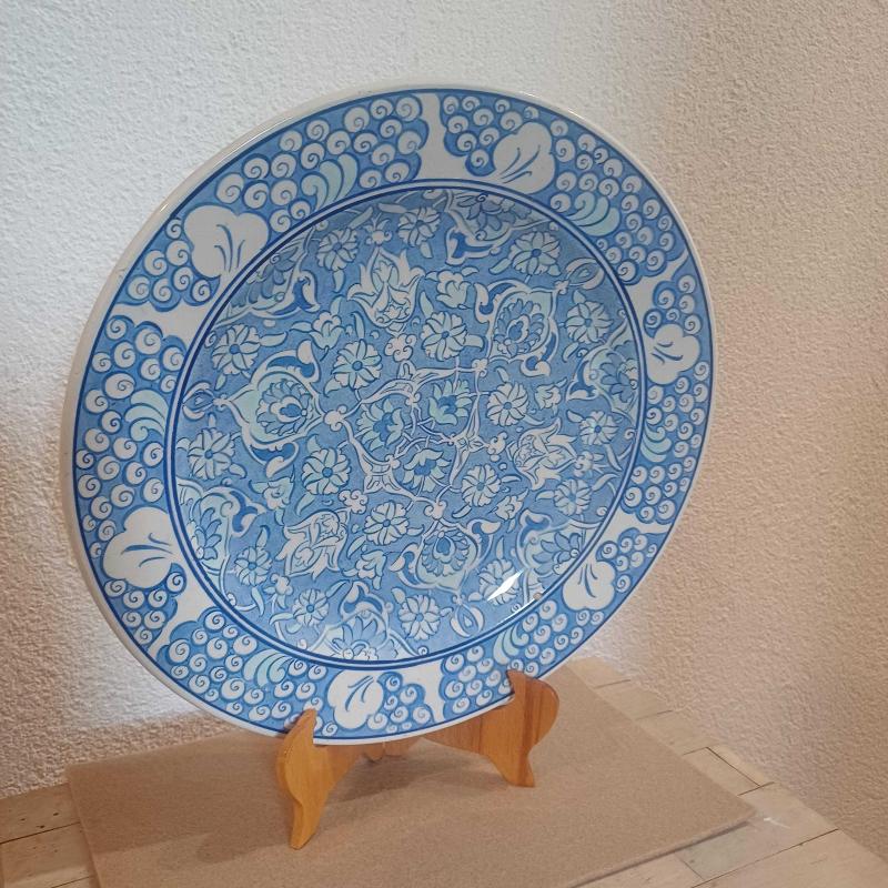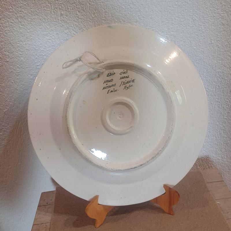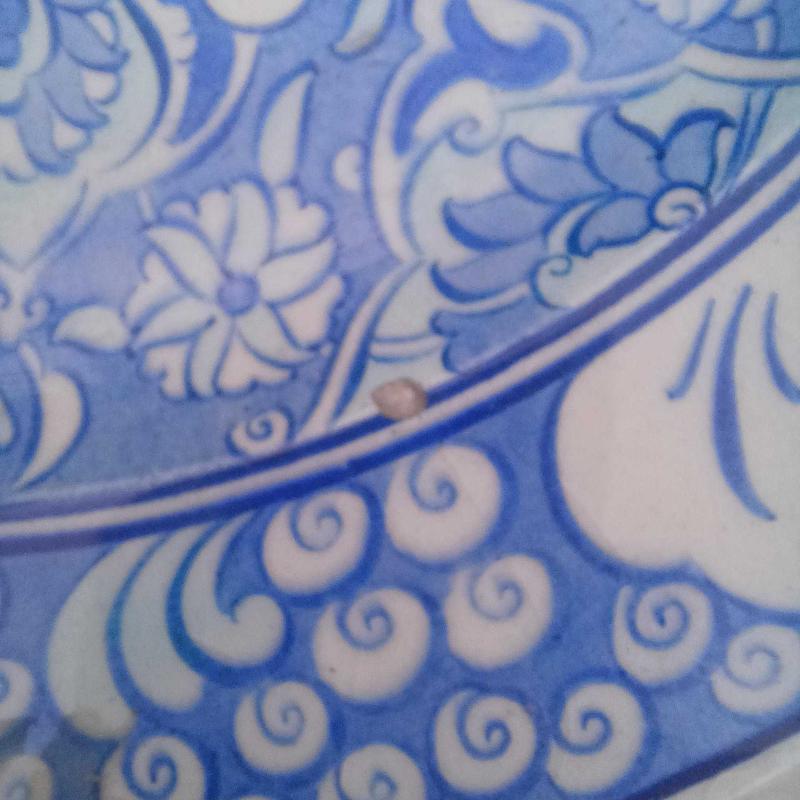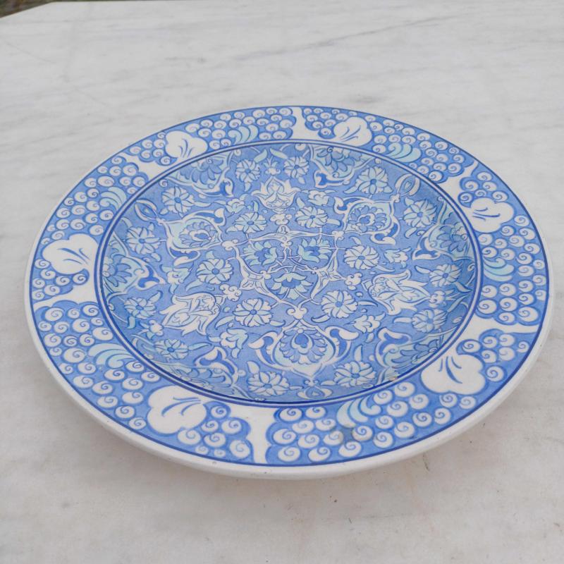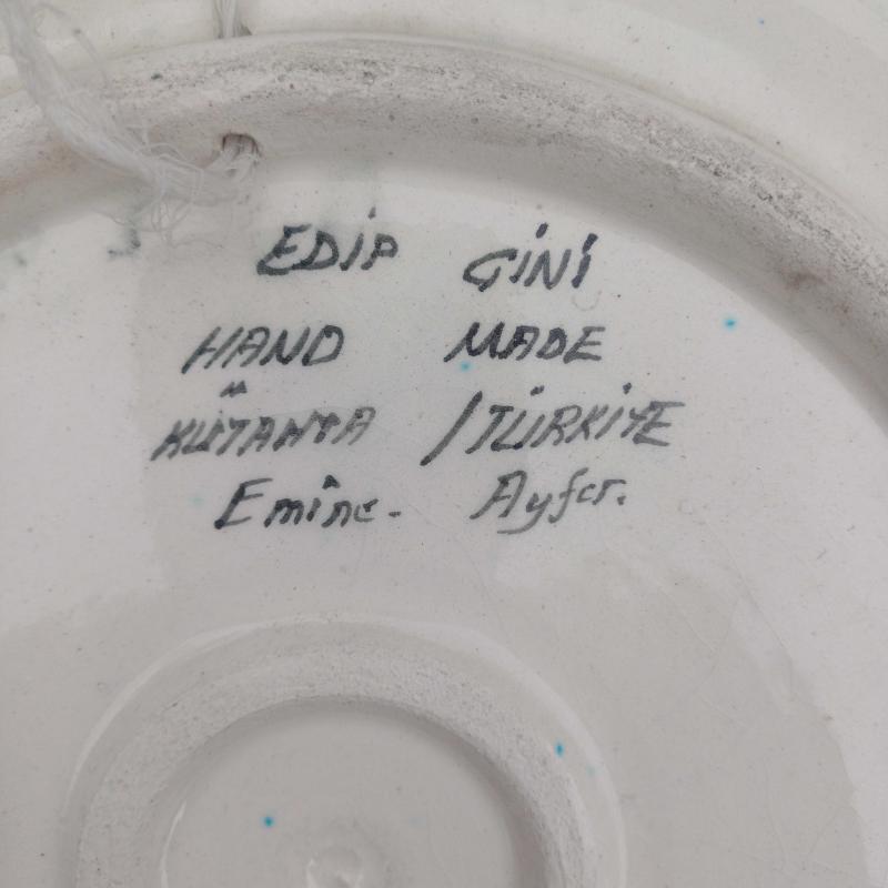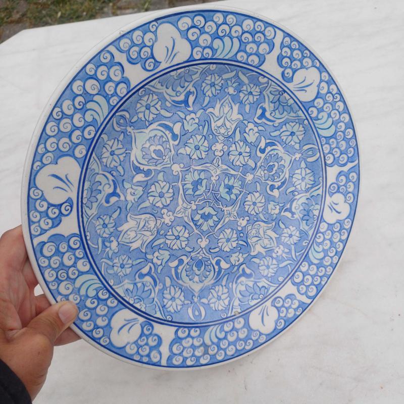 Edip çini. El boyama. Mavi ,Beyaz. Kenarlar Halic desen. Yüzeyde çok minik atık ve sır çatlakları mevcut. Çap 30 cm