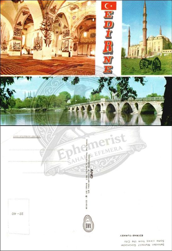 Edirne, Şehir, Kartpostal, 1970’ler: Selimiye Camii, Eski Camii iç mekânı ve Meriç Köprüsü manzaralarından oluşan üçlü kolaj, kentin simgesel yapılarıyla. başlıklı ürün, Efemera, Müzik, Sinema > Kartpostallar > Şehir Kartpostalı > 1960 ve sonrası kategorisi altında İkinci El olarak satılmaktadır.