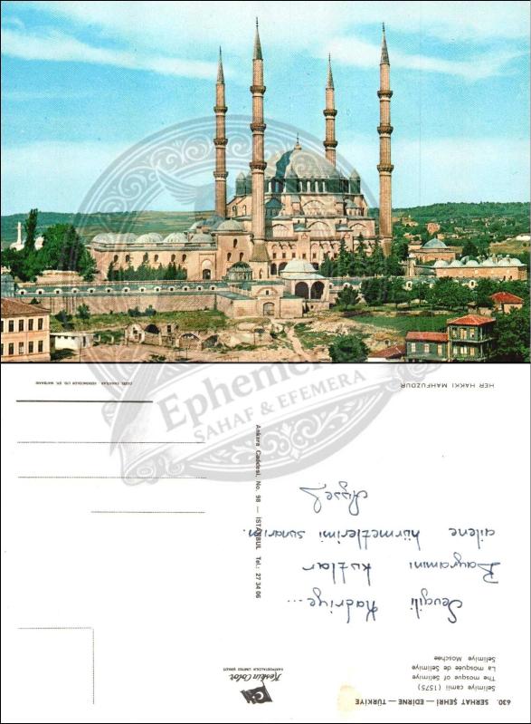 Edirne, Selimiye Camii, Kartpostal, 1970/80’ler: Dört minareli cami, geniş avlu, çevre yapıları ve yeşil alanlarla klasik Osmanlı mimarisi. başlıklı ürün, Efemera, Müzik, Sinema > Kartpostallar > Şehir Kartpostalı > 1960 ve sonrası kategorisi altında İkinci El olarak satılmaktadır.