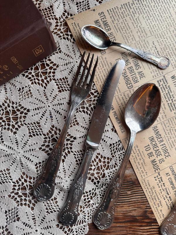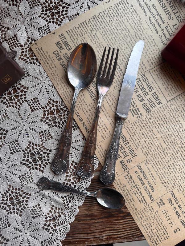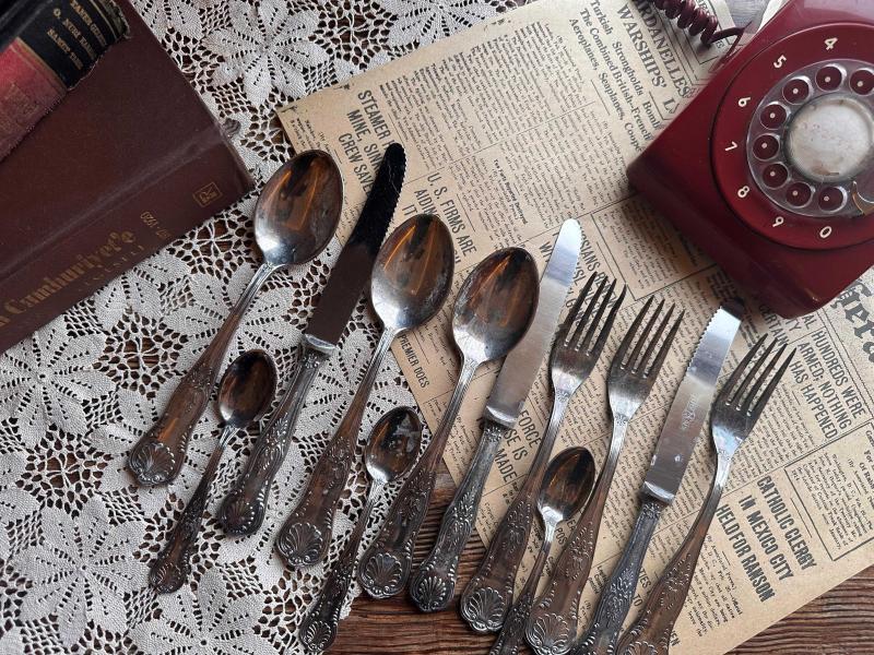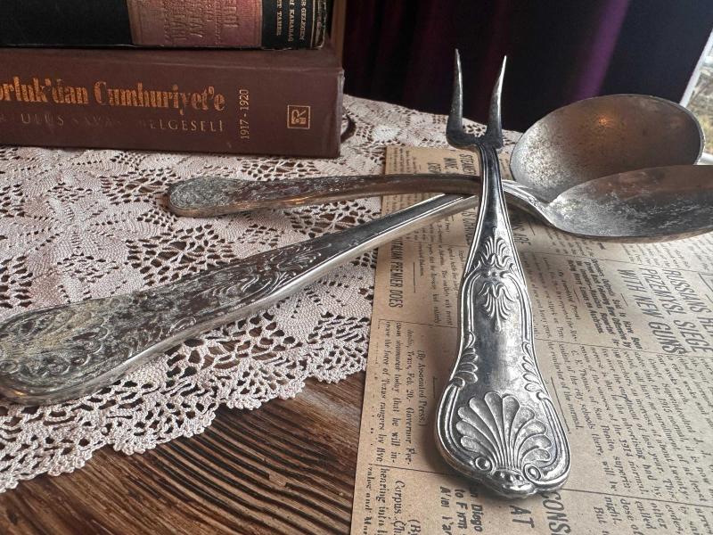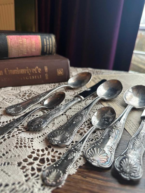 Antika Çatal Bıçak Kaşık seti 51 parça eksiksiz tarihin izleri hala üzerinde. Parlatma yaptırmadım alan kişi yaptırabilir. 800 ayar yoğun gümüş kaplama. Tam bir antika. Nesilden nesile aktarılacak takım. Damgaların tamamı her adedin üzerinde mevcut 1. sınıf kalite. Süper Inox İtalyan menşei
